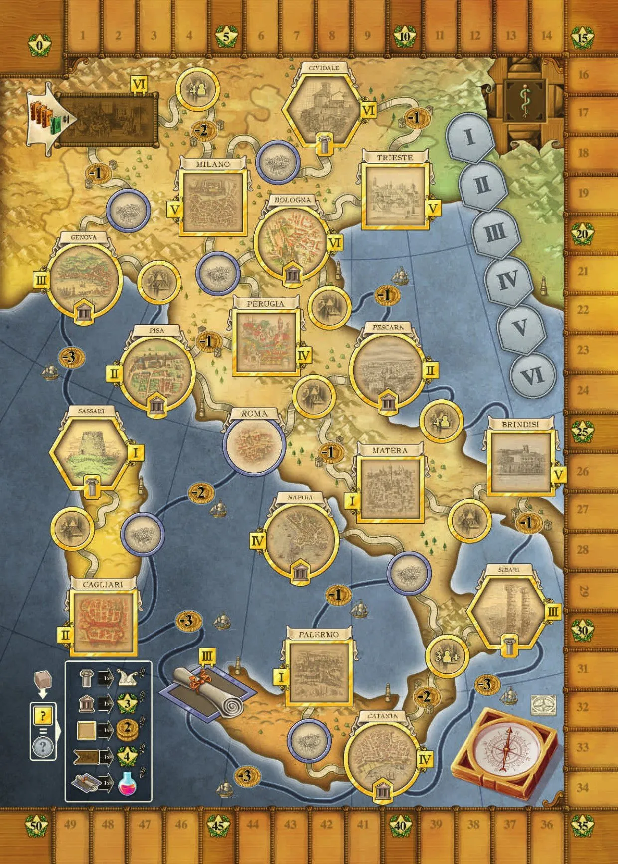 The game is played over six rounds. Each round, every player plays five cards from their hand, and each played card allows the player to perform one of the many actions of the game. An action can have a variety of effects, which depend on the symbols on the board. At the end of the round, a player can take back all the cards except for one. One card has to remain on the board, which means that you give up one possibility of doing that action, but also that that very action will be carried out with greater strength. Fortunately, you can acquire new cards with additional powers to perform more actions.