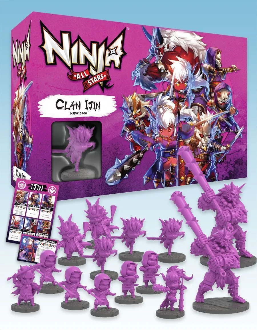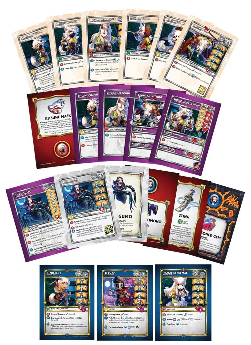 Ninja All Stars allows for 2 to 4 players to take control of a team of ninja (this may be a pre-rolled team or a team purchased with points) and battle over objectives. Each Ninja Clan is drawn from a different element (6 in total), with each element providing different bonuses in-game. As well, the game’s dice mechanic is based on the element system, using a rock-paper-scissors type of dice elimination to determine the outcome of various aspects such as combat, searching, and special abilities. It is important to note that combat is not a simple “I rolled more swords than your shields”; the elimination of dice will give the winner a choice of different combat results based on the remaining dice. The interesting point here is, ninja don’t die in this game-rather,they are knocked out and placed in their team’s dojo, where they rest and recover and may eventually be brought back onto the board. The rules allow for one-off scenario games as well as league play with guidelines on ninja advancement, meaning that players can develop their ninja over many games.