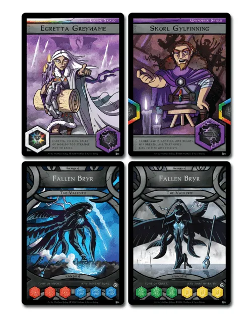 Norsaga is a 2-4 player puzzle battle card game in which players take the role of Viking poets who are vying to describe their personal saga and their heroic ancestry, while embellishing their story with tricks they’ve inherited. The first player whose family tree includes all of the heroic traits necessary for them to complete the saga they’re describing wins the game.