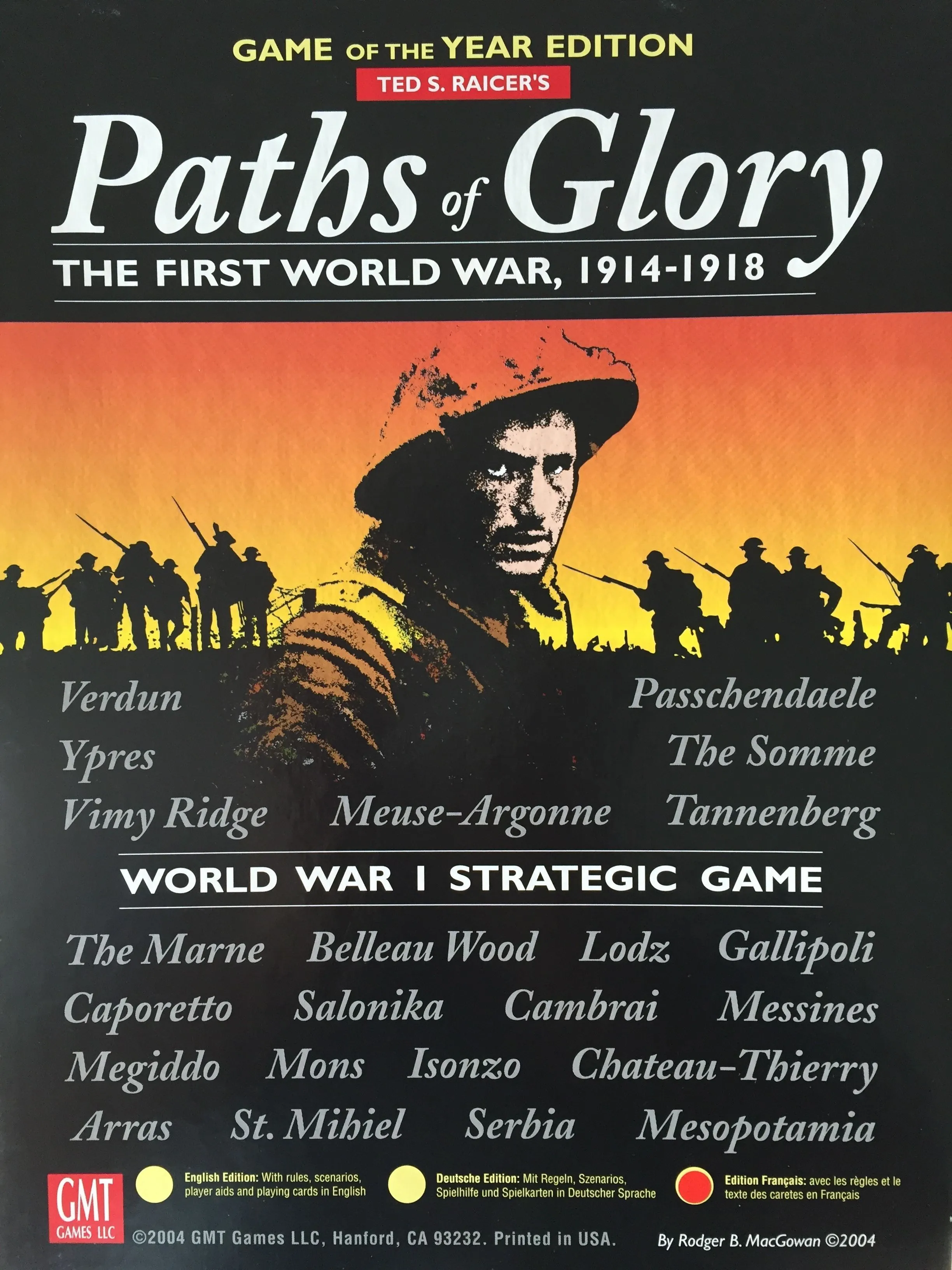Paths of Glory: The First World War, designed by six-time Charles S. Roberts awards winner, Ted Raicer, allows players to step into the shoes of the monarchs and marshals who triumphed and bungled from 1914 to 1918. As the Central Powers you must use the advantage of interior lines and the fighting skill of the Imperial German Army to win your rightful âplace in the sun.â As the Entente Powers (Allies) you must bring your greater numbers to bear to put an end to German militarism and ensure this is the war âto end all wars.â Both players will find their generalship and strategic abilities put to the test as Paths of Gloryâs innovative game systems let you recreate all the dramatic events of World War I.