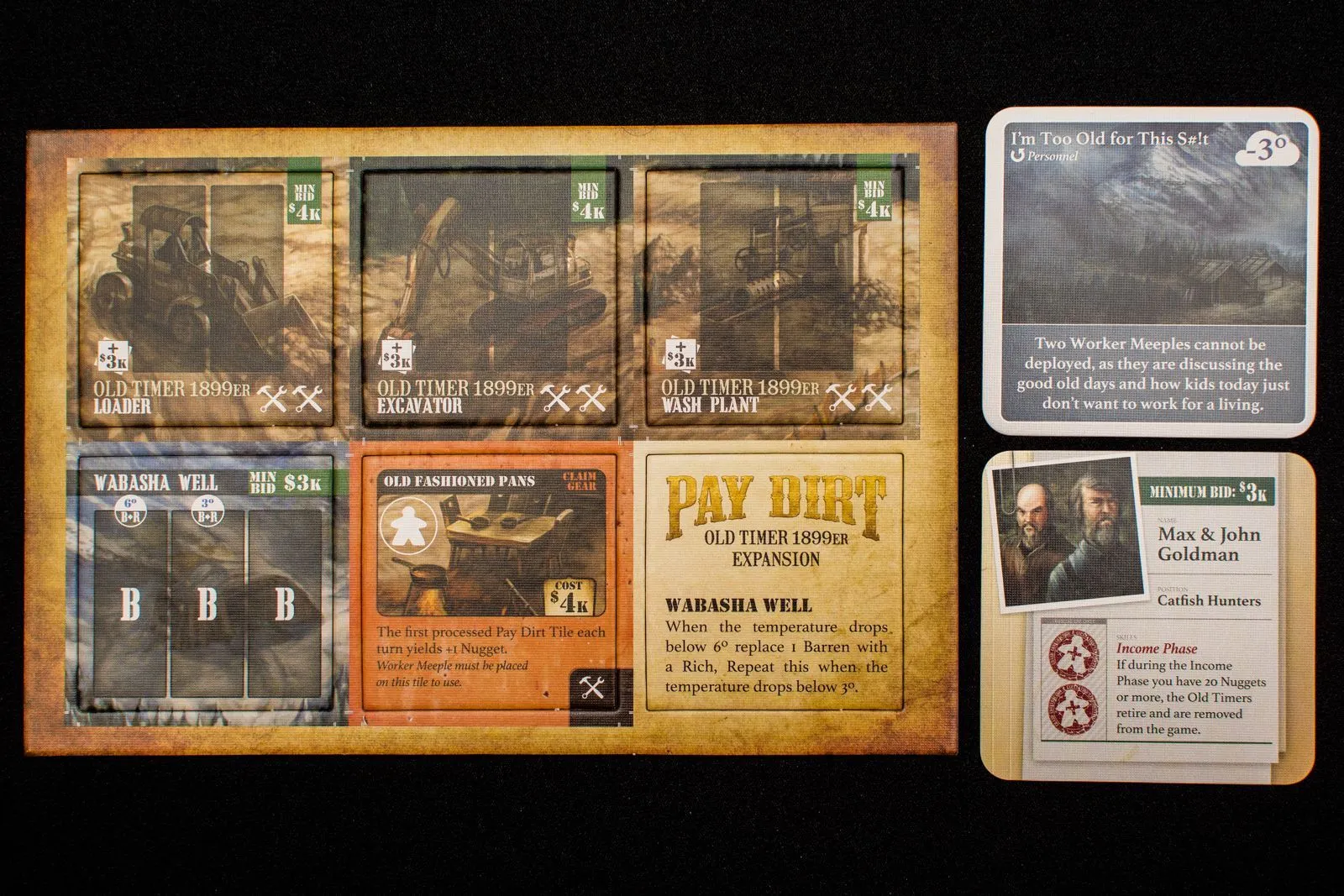 In Pay Dirt players start with a small basic crew, an unimpressive claim, mediocre equipment and just a little bit of cash to make a go in one of the toughest competitions this side of the globe. Gold mining isn’t cheap and players will have to sell their gold throughout the game to keep the equipment running and their workers happy. Through clever use of their equipment and workers, players can make their mining outfits more efficient and dialed in to their preference of play. Will you recruit heavily and stack your camp with workers or will you keep your eyes on better and more efficient equipment? Will you have what it takes to hit to strike it rich and hit pay dirt?