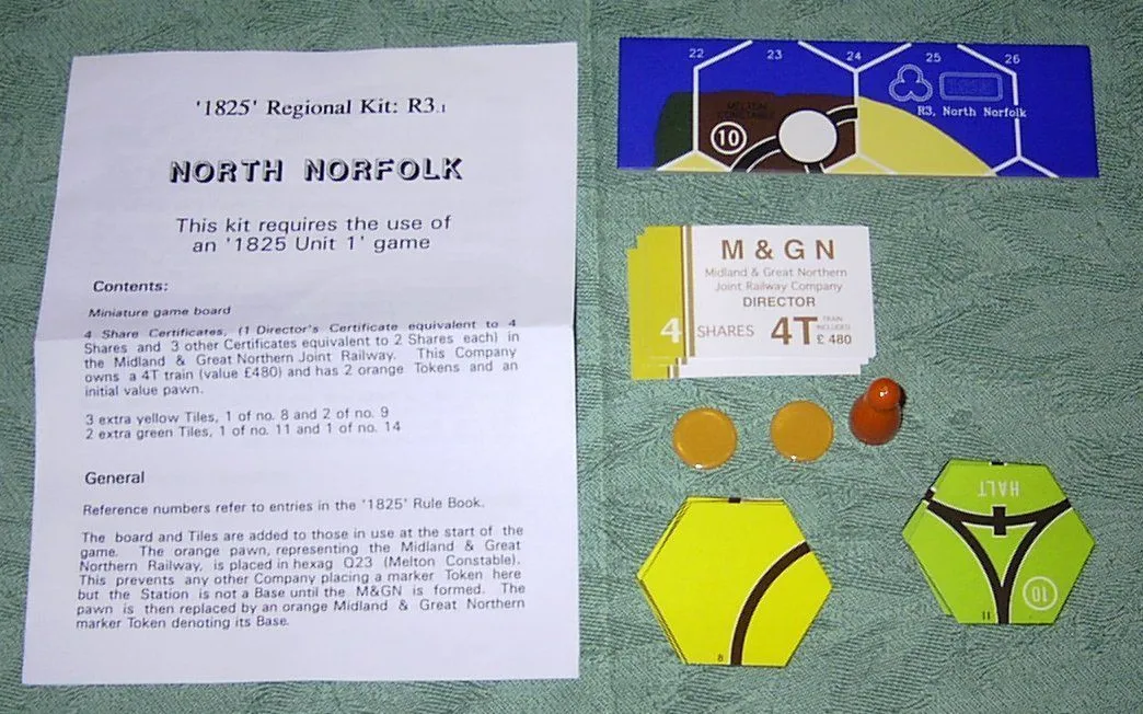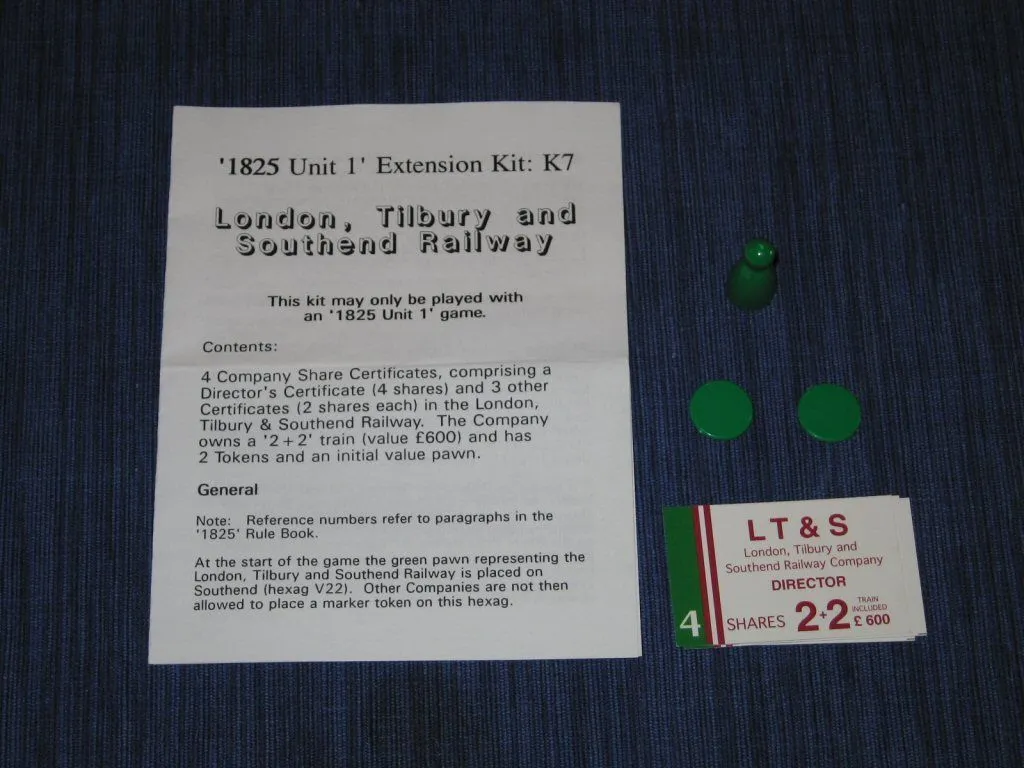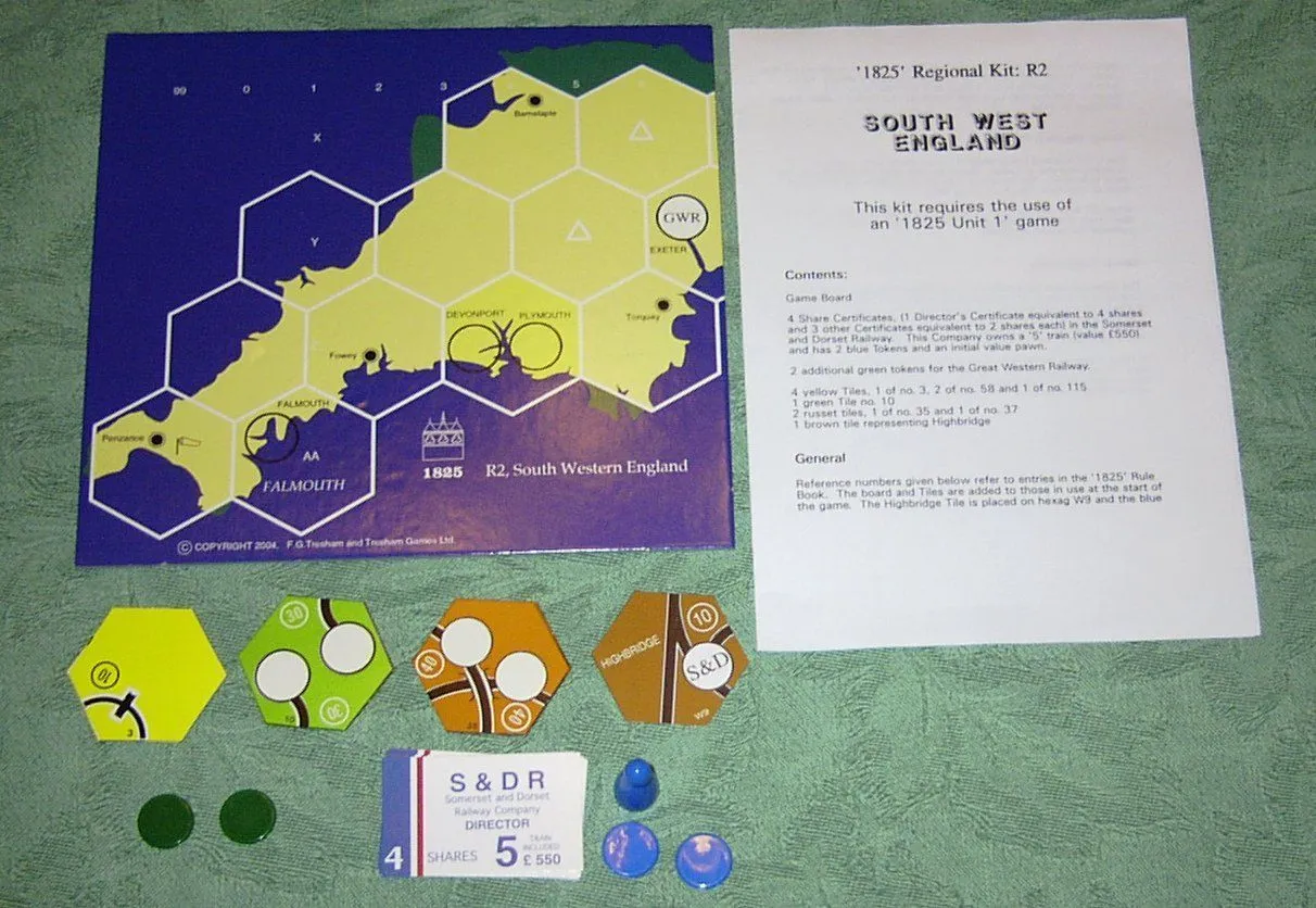 1825 is Francis Tresham’s “1829 revised” 18xx game. It is released in 3 distinct modules, or units. 1825 Unit 1 and 1825 Unit 2 broadly cover the same area as the 1829 southern board. 1825 Unit 3 covers most of the remainder of England and Scotland, and with unit 2 will cover the same area as the 1829 northern board. Along with the units are a number of expansion kits, which introduce extra money, trains, tiles, companies, and phases. There are currently three, and will be four regional kits, which cover areas of England, Scotland and Wales not included in the three base units.