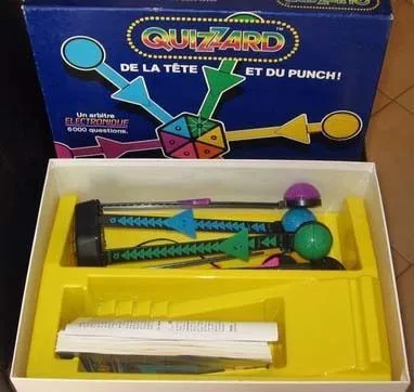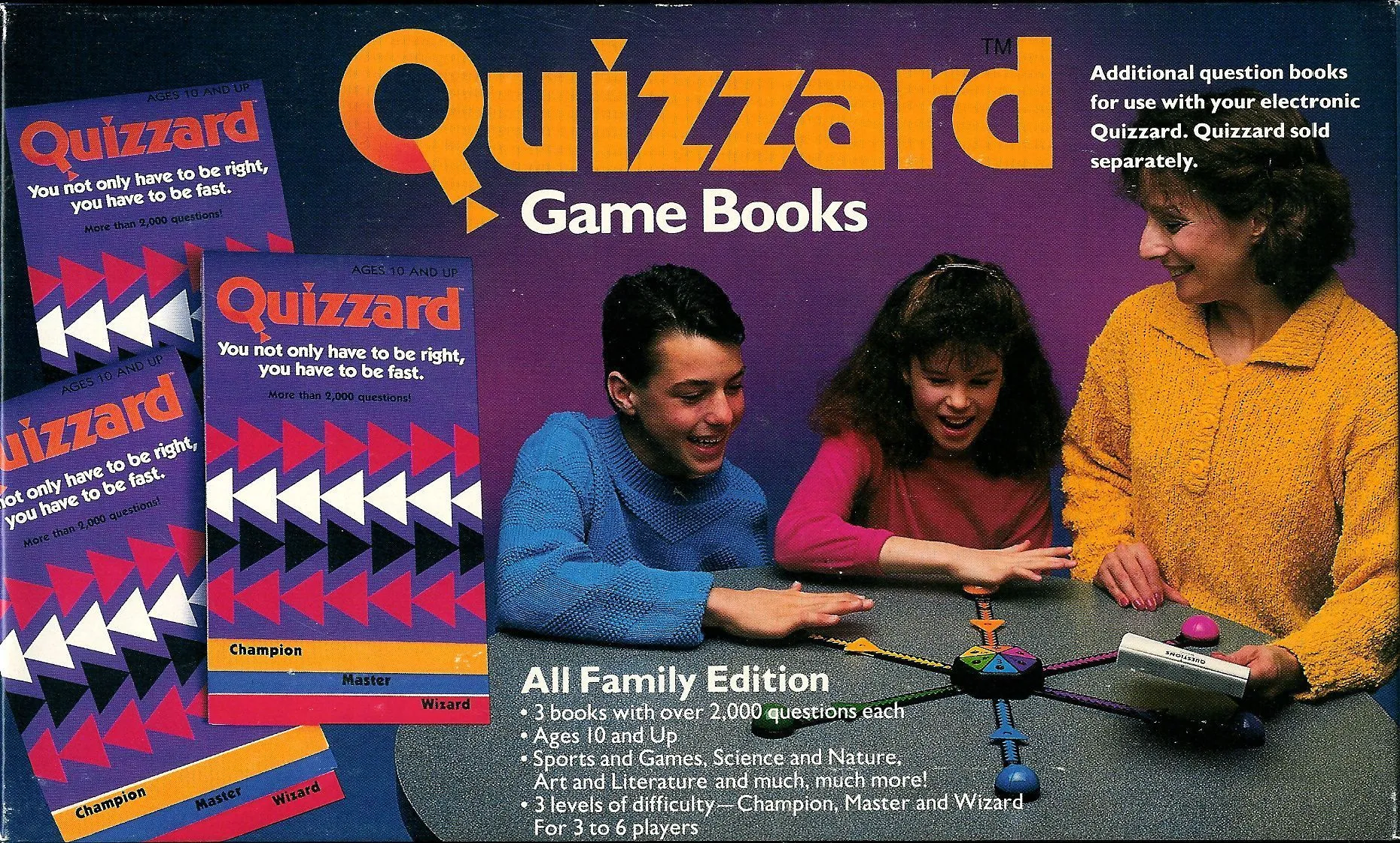 Quizzard is a trivia game where you not only have to be right, you have to be fast. The heart of the game is an electronic buzzer device that records who will answer the question first. Up to 6 players have this buzzer pad in front of them and the first one who hits the button gets to answer. However, you can lose points for incorrect answers so before you hit the button you’d better know the answer. The game comes with a book of trivia questions divided into Champion, Master, and Wizard levels of play. Rules for nine variations of the 3 levels are included in the rules. Quizzard has three game setting labeled Fast Hands, Strategy (machine selects who will answer) and Countdown. Quizzard runs on 4 AA batteries and has a built-in score track.