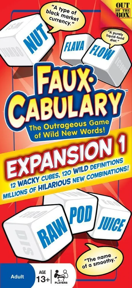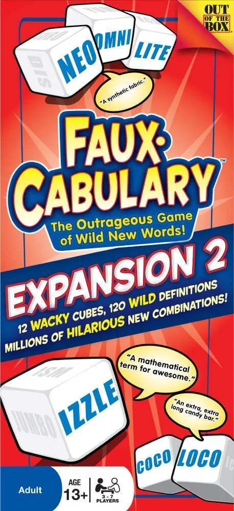 In Faux•Cabulary, players create new words for descriptions that lack appropriate nomenclature by using randomly drawn “word segment” dice included in the game.