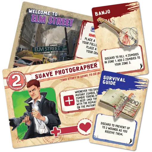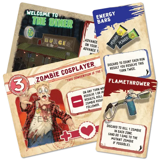 This streamlined version removes several decks from the original game, including the Fleeing deck and Event deck. Players rolls six dice instead of five and there are now different combos to mitigate against tough zombie-filled rolls. Additionally, players can now use followers to soak damage coming in from zombies.