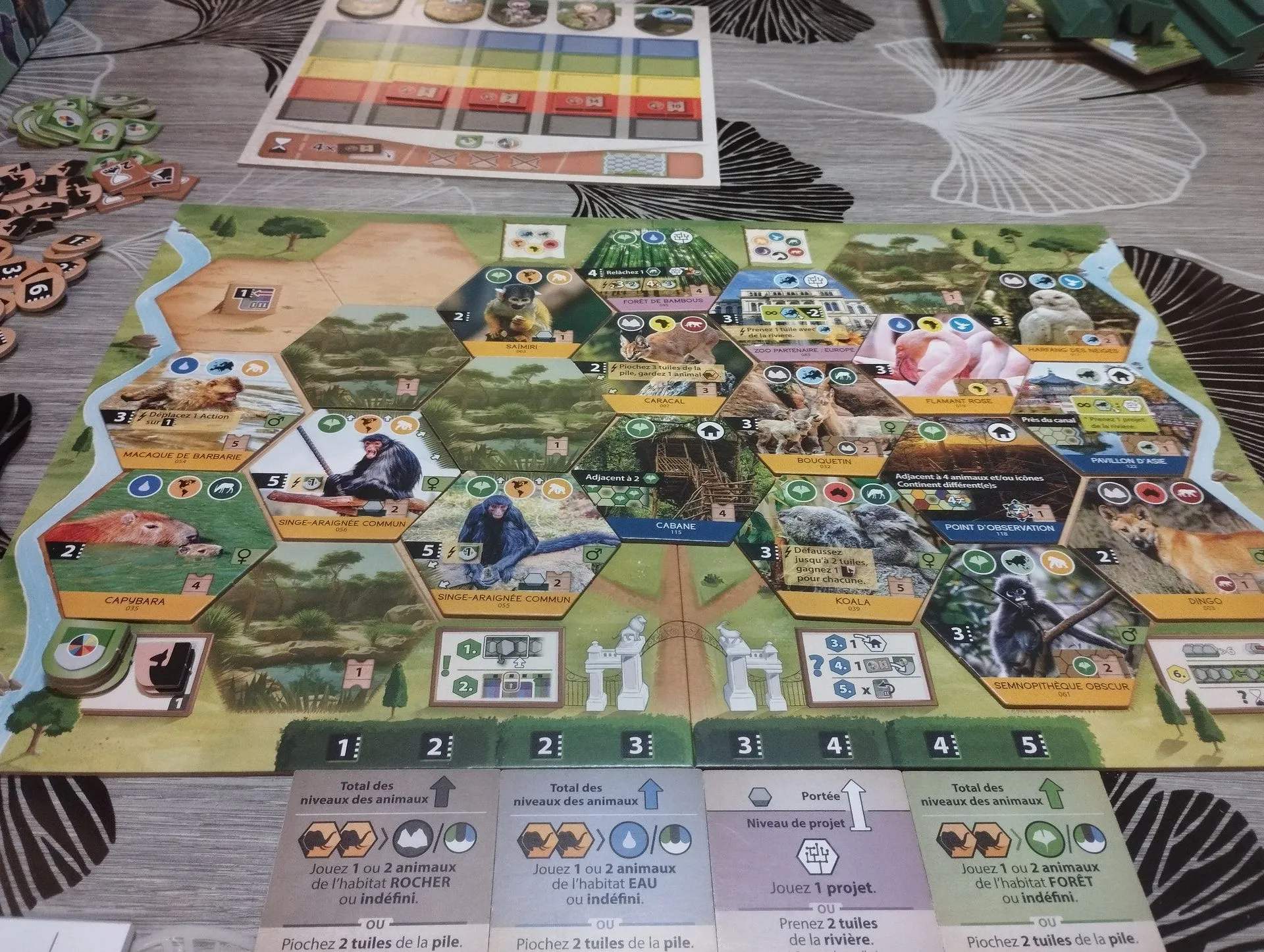 Un ensemble de 135 tuiles uniques de zoo vous fournit des animaux, des bâtiments et des projets. À chaque partie, vous devez trouver la meilleure combinaison parmi celles disponibles pour construire l’établissement zoologique le plus performant. Différents effets sur les tuiles vous aideront à atteindre les objectifs de conservation et à augmenter l’attrait de votre zoo.