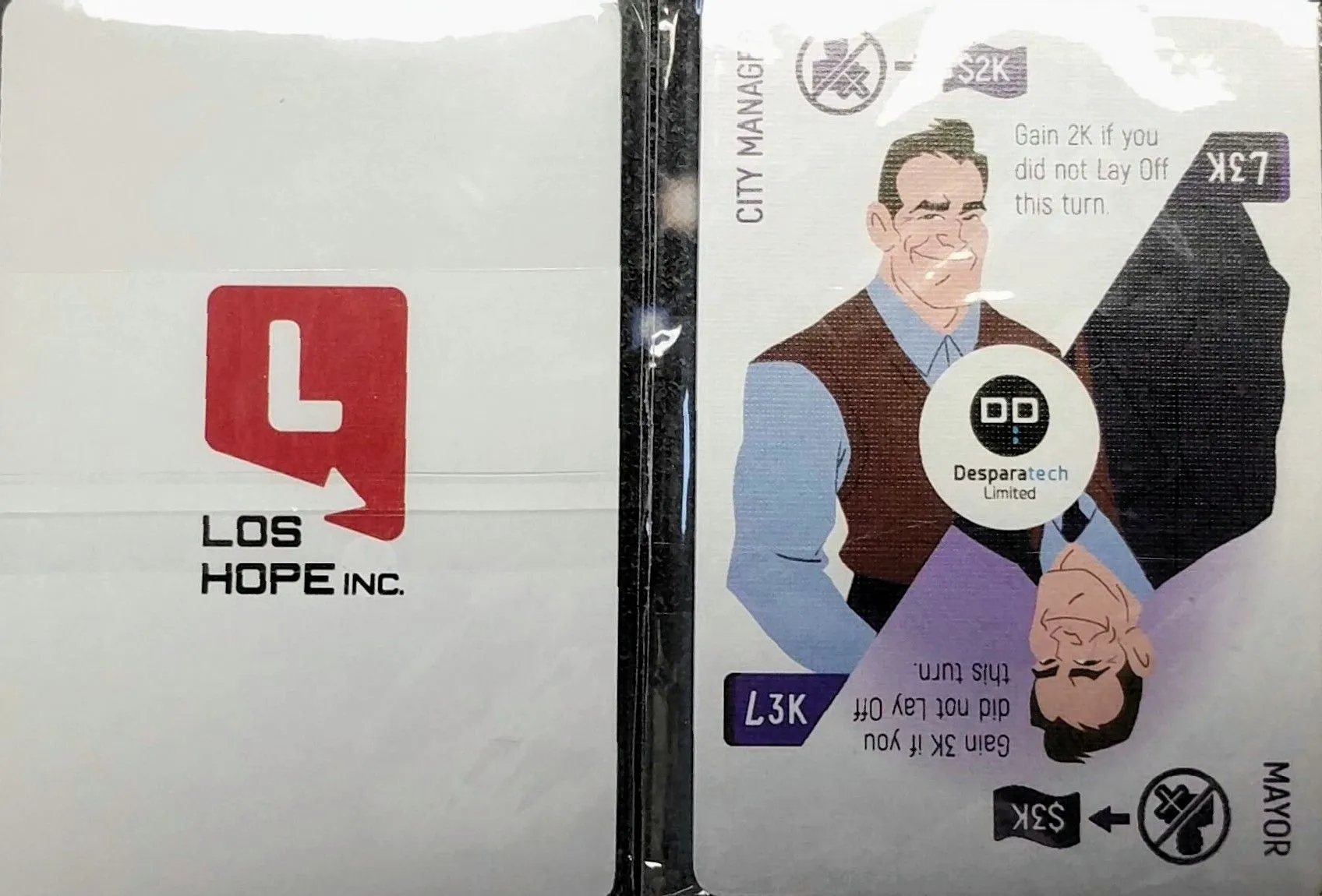 When does the game end? Each time a player’s draw deck is emptied and recycled from its discard pile, she has a chance to call an Audit. When an Audit is called, that player counts her total revenue earned, then reduce it by the salary of all existing employees in her deck, as well as any unpaid loans. If it is still positive, she wins the game right away! Dare you call an Audit before your rival? Doing so is risky, since you either win the game right away or you gain more debt because you have to pay for wasting the auditors’ time, putting you further from victory.