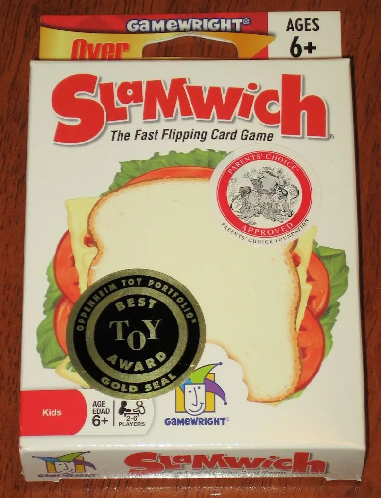 Slamwich is a real-time, pattern recognition card game such as Twitch, Set, and Bongo, with cards that are die-cut to resemble slices of bread topped with sandwich items, sandwich thieves, and sandwich munchers.