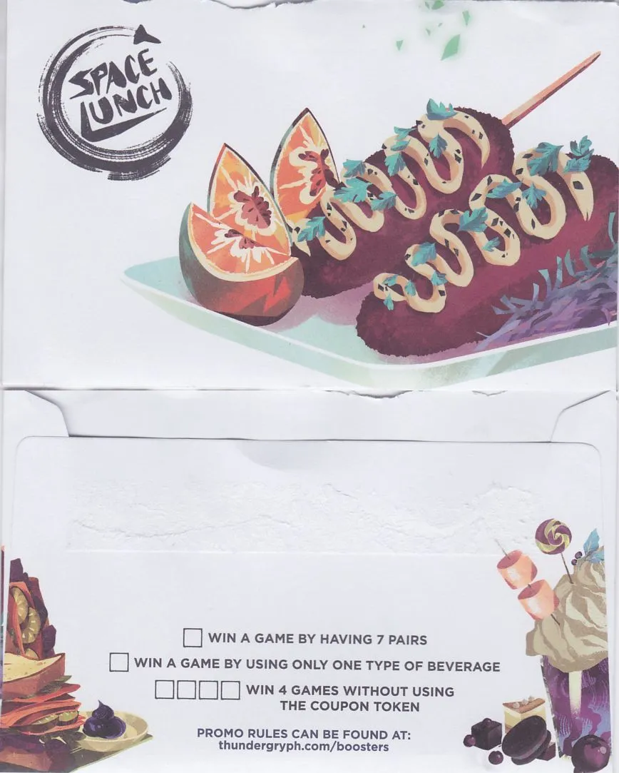 In Space Lunch, you take alternating turns and collect food cards until only six food cards remain in the grid, or until a player completes three sets of three food cards of the same type.