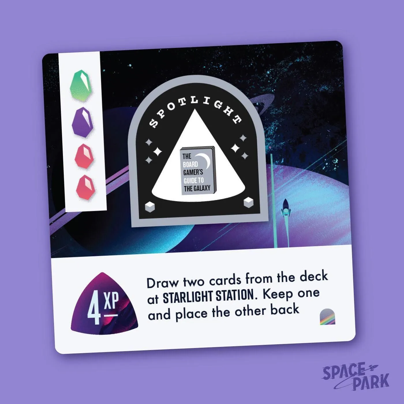 Space Park features a modular board where seven destinations are randomly arranged to form a circle between players. During a player’s turn, rockets will be on three of the board’s seven destinations. These rockets symbolize what destinations are available for a player to travel to. Once a player travels to a destination by performing its action, that rocket moves to the next open destination clockwise.