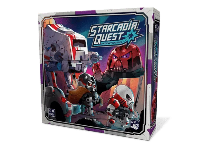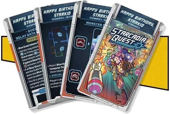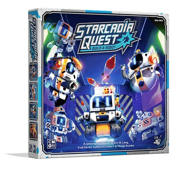 Starcadia Quest is a new standalone campaign game for 2 to 4 players. The dastardly Supreme Commander Thorne is looking to control the galaxy (at least a good portion of it) and each player leads a crew of two heroes flying through space on a quest to defeat him. While they share the same goal, the different crews are not exactly in league with one another. They will compete as much with each other as they do with Thorne and his army.