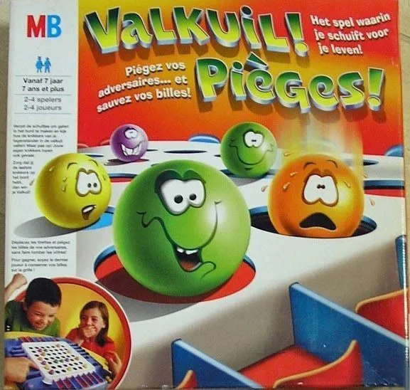 The game consists of a 7x7 board with horizontal and vertical slides that can be in any of three positions each. Each slide has a certain number of holes in it. Initially, the board is set up in any random position, then the players deploy their marbles onto the non-holed spaces. On your turn, you change a slider’s setting, hoping to open new holes underneath opponents’ marbles. The last player to Stay Alive wins.