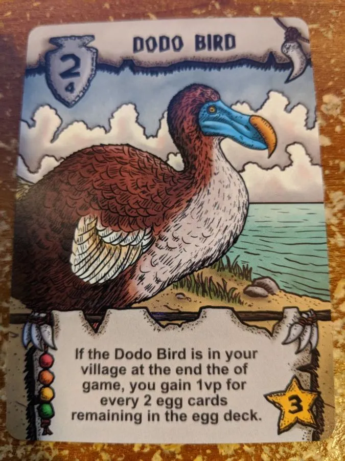 Each turn you draw new characters from the tribal deck. These cards will either be humans or tamed beasts. You then get to use your cards to form a hunting party to either travel to the wilderness or to secure an available location card. Lastly, you may add one card face-up to your village (these cards may be used in later rounds) and then draw back up. Alternatively, you may pass on hunting and rest two characters (placing them in your village) and then draw one egg card. Egg cards are gained in many ways, and are used to score end-game bonus points.