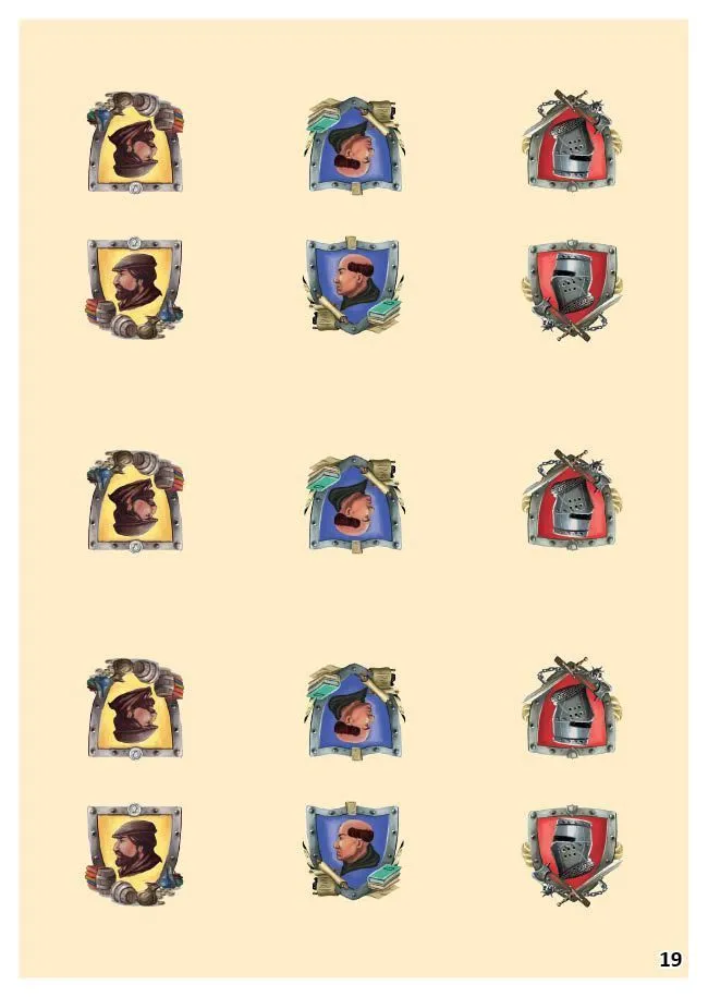 In game end scoring, you compare all symbols with all of your competitors and gain additional points when having more symbols of a kind, and fewer points in case of a tie. Finally, you score more points for each face-to-face victory when comparing the symbols on cards you have taken out during the game as part of the city wall.