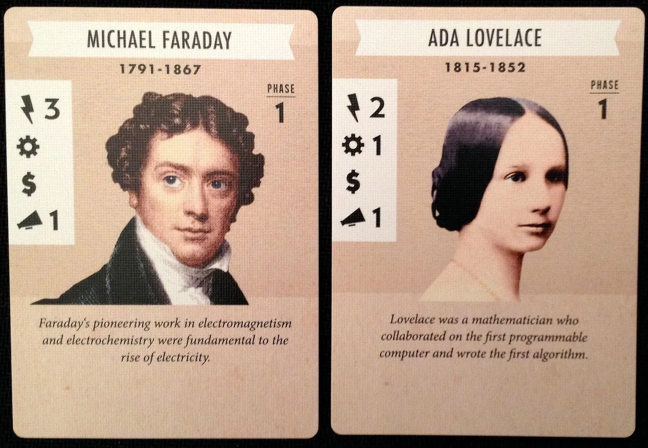 Players control a small group of legendary figures from the War of Currents, each rated in Invention, Engineering, Finance and Public Relations. Each turn these legends are allocated to help research, commercialize or patent technology; influence the public’s perception about the inventors and AC or DC technology; bid on and hopefully secure either residential, exhibition or power generation projects in cities around the 1880’s United States. Money is tight and players may need to sell shares of their company in order to do everything they need to succeed. But be careful: other companies can buy stock you release, and the winner is the player whose company’s stock is worth the most at the end of the game!