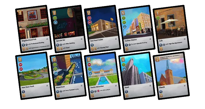 Each turn, each player places a card from his hand face down, then all cards are simultaneously revealed. The cards show the buildings that the players want to build that round; building costs are paid for by discarding other cards. Some buildings provide income at the end of the round in the form of new cards, with certain buildings increasing the income provided by others; similarly, some buildings boost the VPs provided by others, with a University, for example, being worth one more VP for each School you have in play.