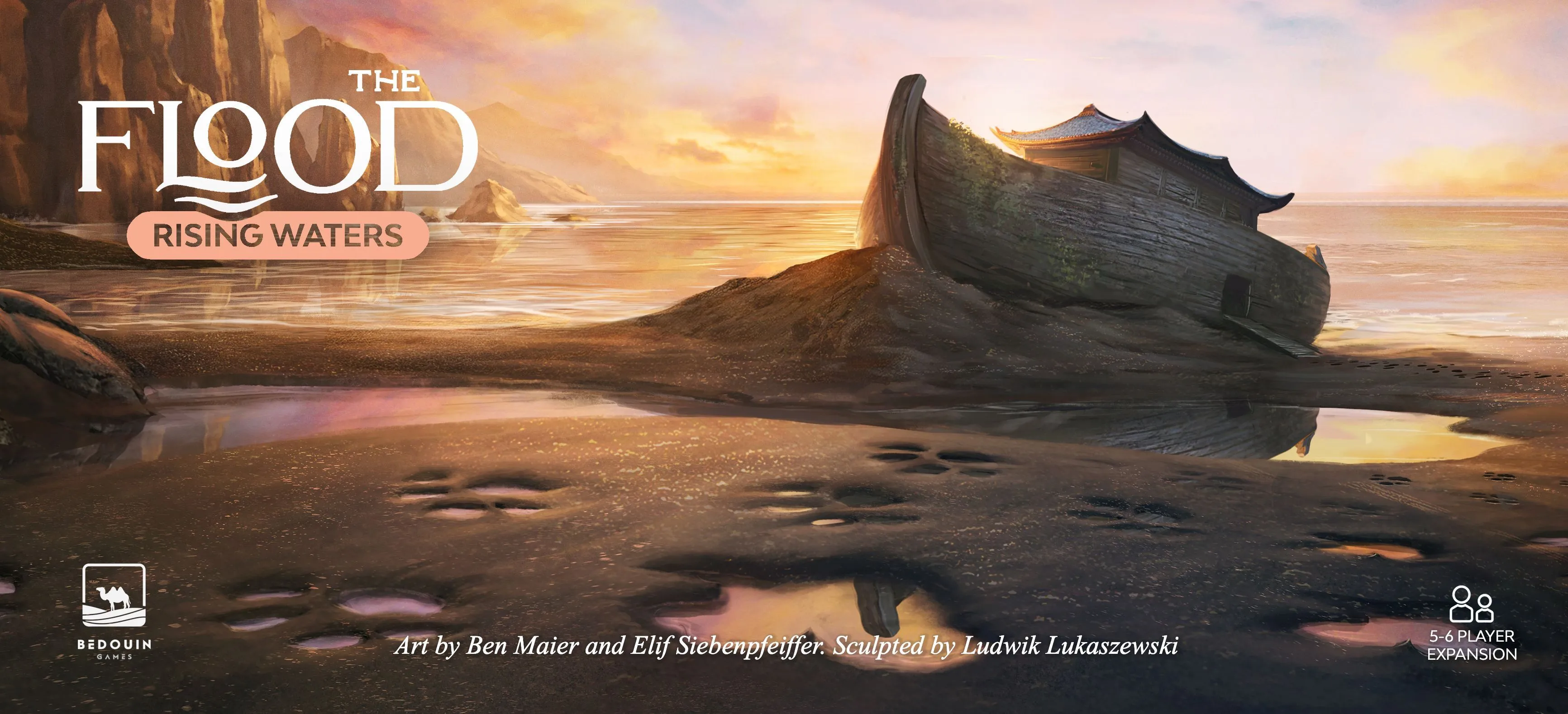 Designed by Bedouin Games and Iden.team Illustrated by Ben Maier, Macro Paganessi, sculpted by Renan Assuncao and Ludwik Lukaszewski. The Flood is a euro-style game. Dice/ resource and event mechanics as well as 140+ miniatures.