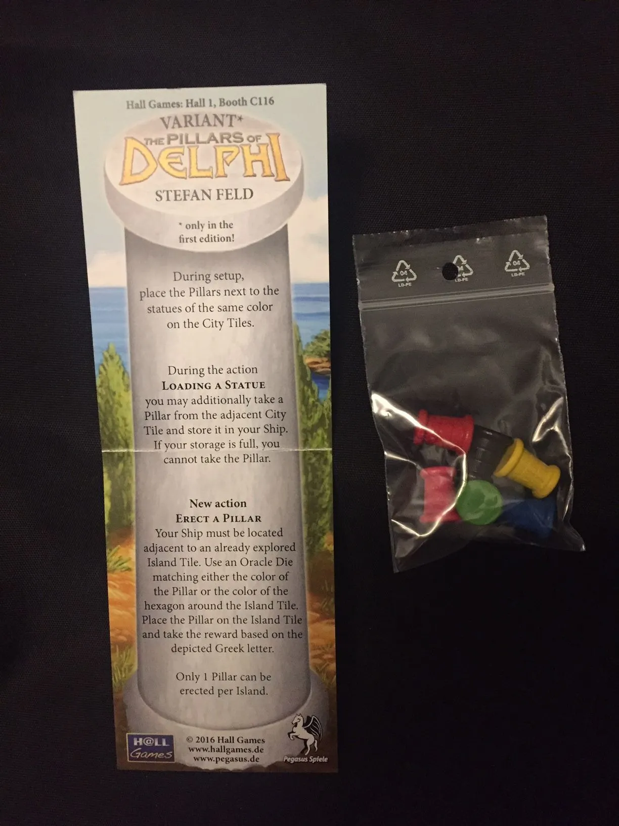 In Stefan Feld’s new game The Oracle of Delphi, the player’s ships travel across a large variable game board of hexagonal tiles showing islands and the surrounding waters. Each player aims to reach certain islands to perform the twelve tasks given by Zeus: e.g., to collect offerings of different colors and to deliver them to corresponding temples, or to slay monsters of a specific type (and color), all of which can be discovered on the islands.