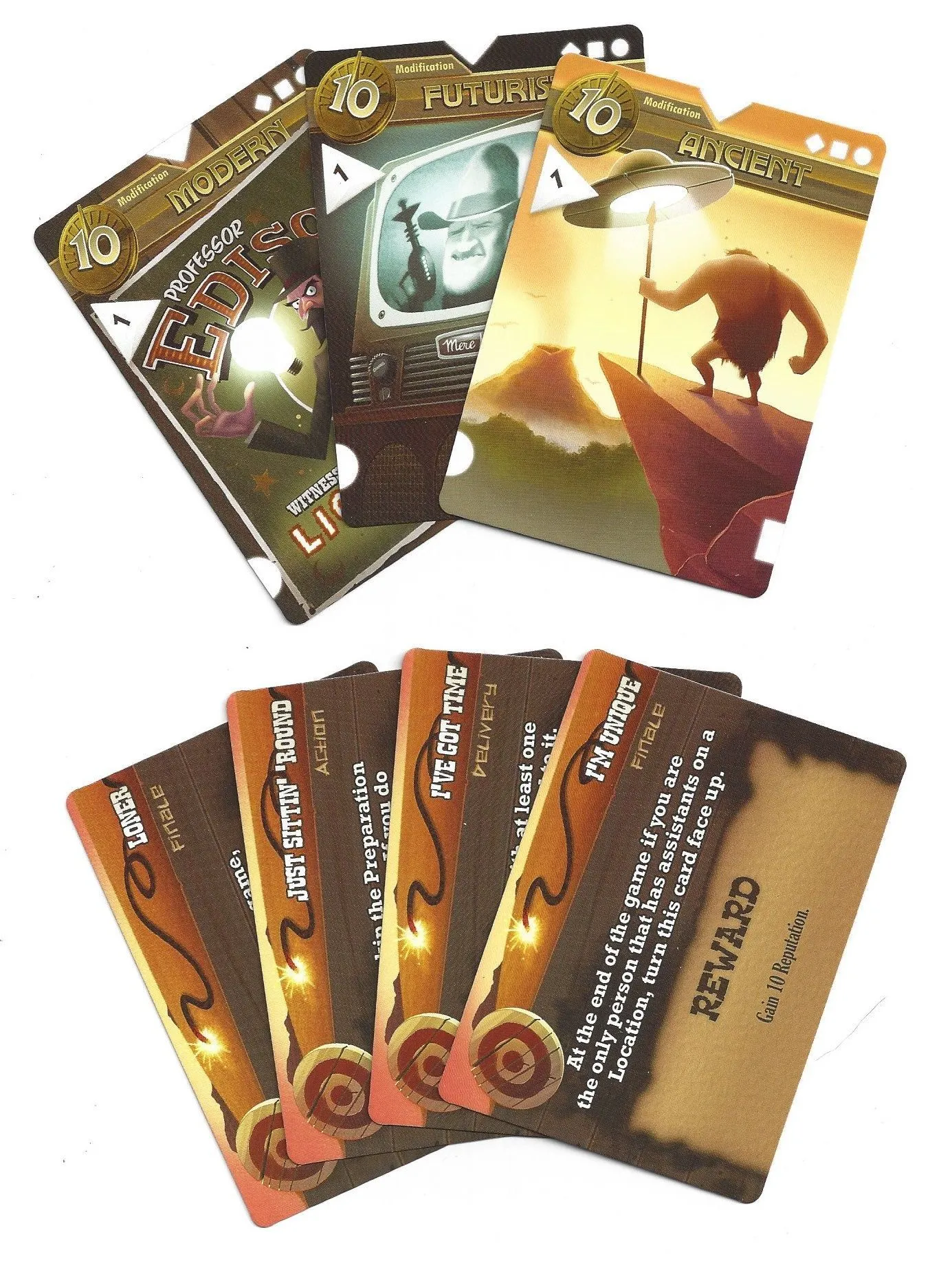 Each turn, players have to deal with and negotiate random events in the area, then continue the turn under those circumstances, by drawing Tinker cards to fill their hand up to five cards, then rolling dice to determine their resources for that turn. Players then spend those resources to build new Gadgets or augment their existing Gadgets with Modifications. These Gadgets and Modifications can then be Delivered to the townsfolk for Reputation. In addition players can choose to scrap cards from their hand, and pull them out of circulation.