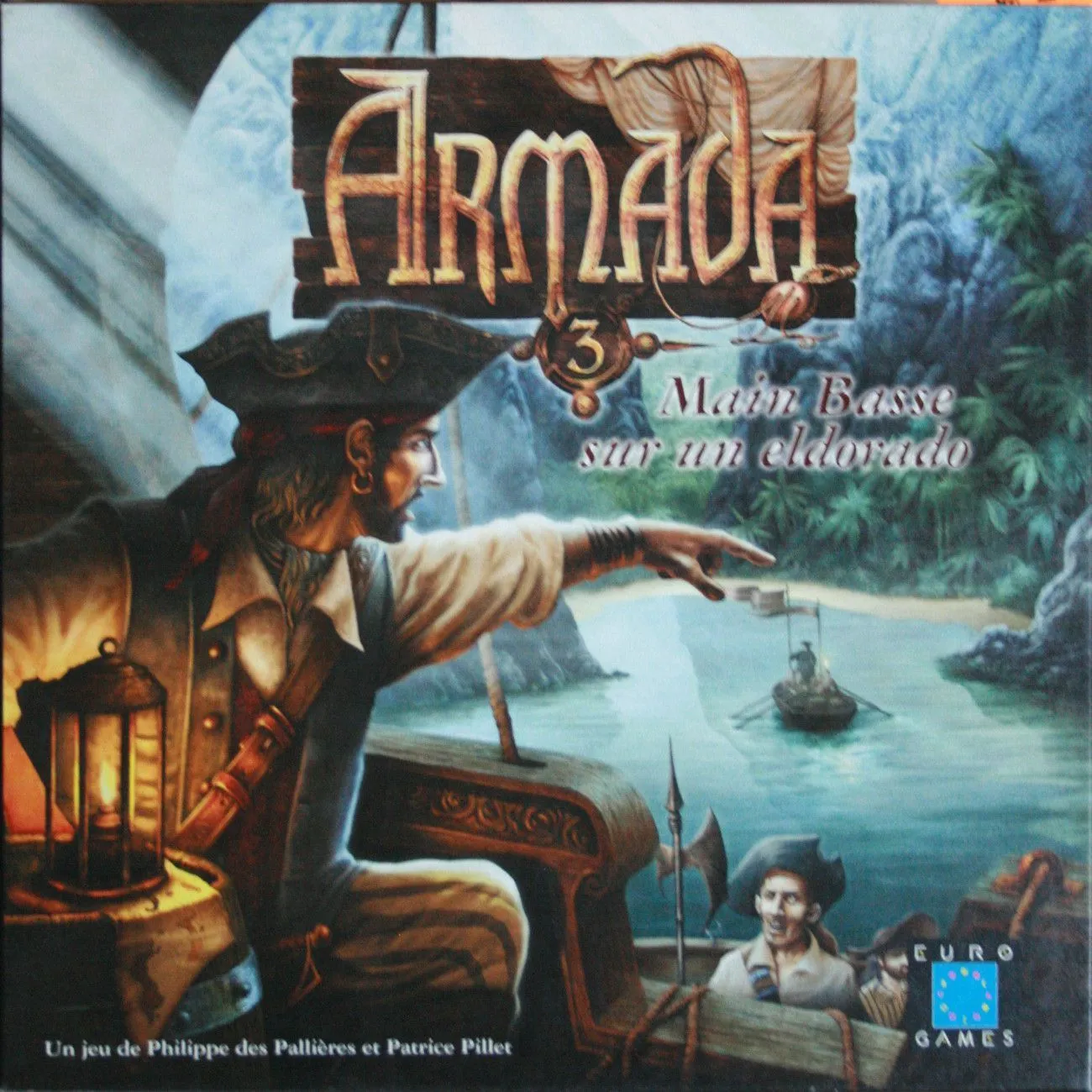 A board game with a nicely realized island group, which offers protection for either four nations or four pirate bands (depending on the edition) and indigenous people. Components: 300 plastic markers, 150 tokens, 8 ships made of metal with 2 masts, 55 cards (3rd edition only), 3 six-sided special dice, 1 rules booklet.
