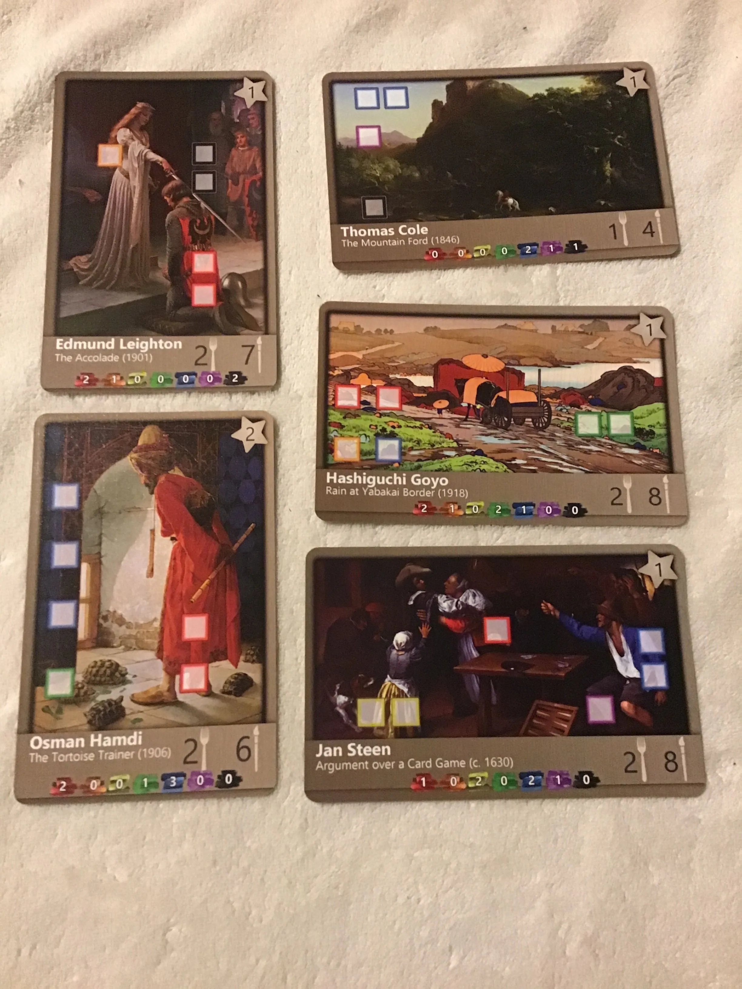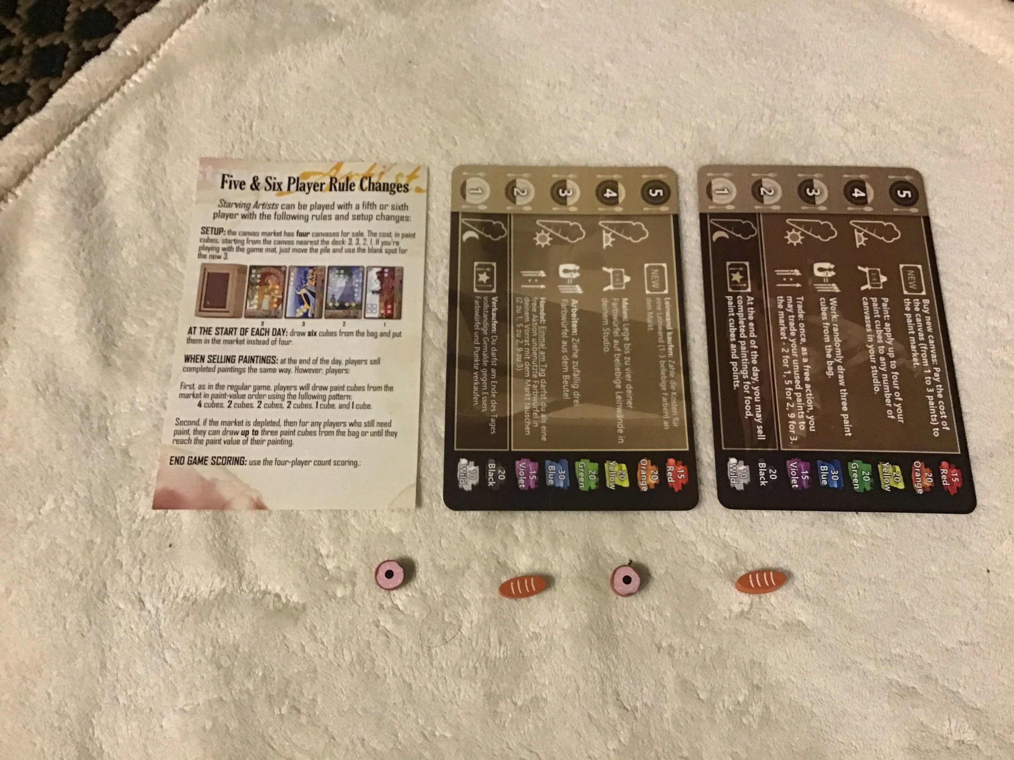 In Starving Artists, you are a painter trying to be famous. In the game, paints are the only currency. On your turn, you can buy canvases, paint them or work for more paint. And, at the end of each round, players can put their completed paintings up for sale for more paint and food.