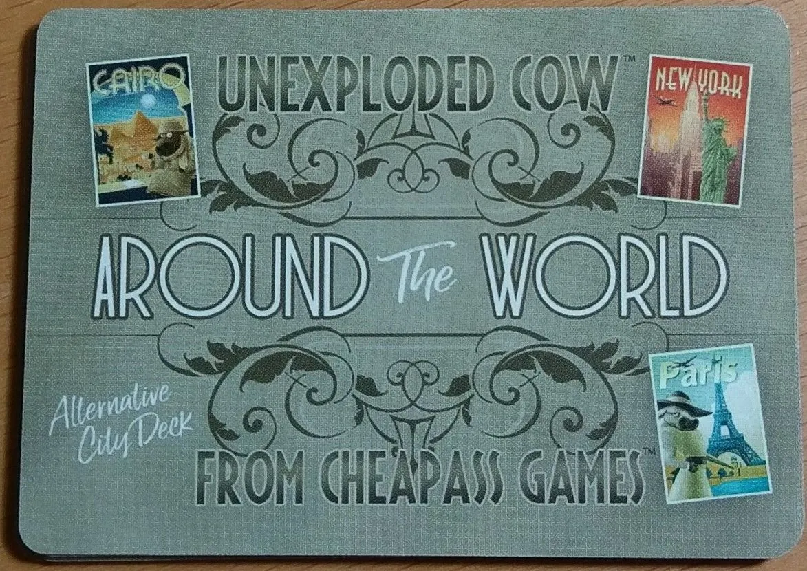 Unexploded Cow is a money game in which players are trying to collect enough points to win the pot. On every turn, you will buy cows and pay for special effects by putting money in the pot, then try to discover bombs with your own cows in an effort to take money out of the pot. All along, you will be earning points from the French as you liberate town after town from the terrors of unexploded bombs, and the player who scores the most points gets whatever’s left in the pot.