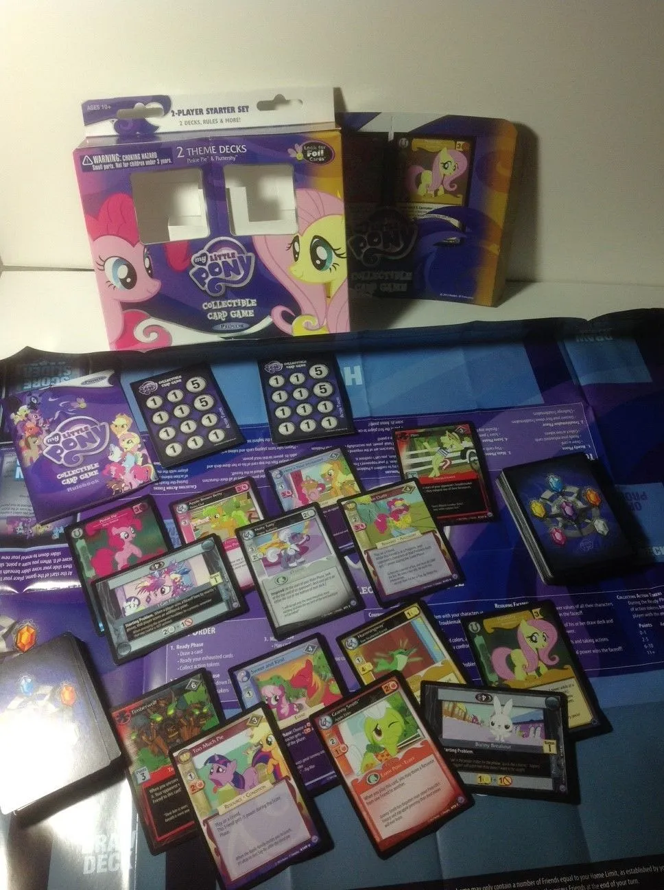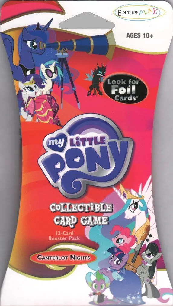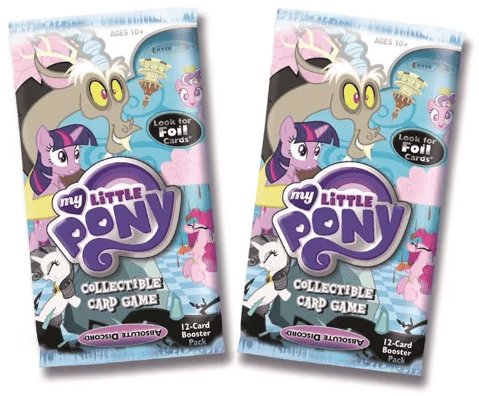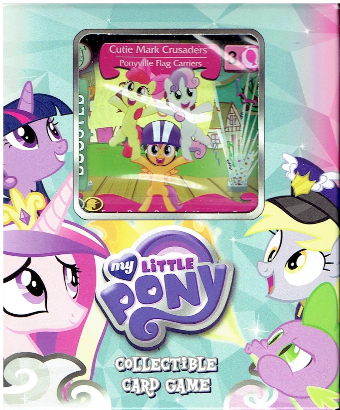 My Little Pony: Collectible Card Game is sold in traditional starter decks, booster packs, and theme decks in addition to starter sets that contain two complete decks and special foil-embossed cards. Theme decks and starter sets are based on the “Mane 6” ponies: Twilight Sparkle, Rainbow Dash, Rarity, Fluttershy, Pinkie Pie, and Applejack.