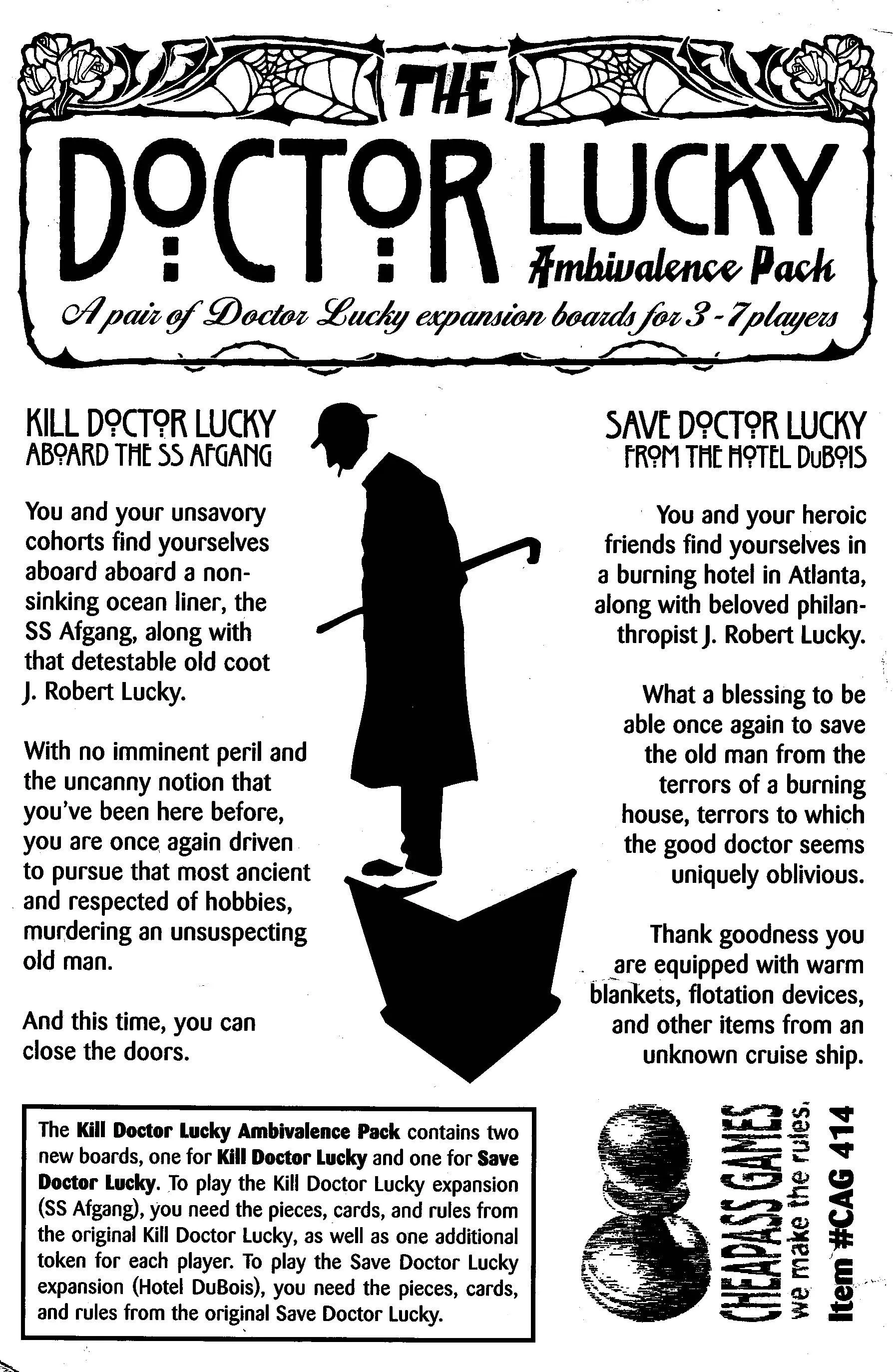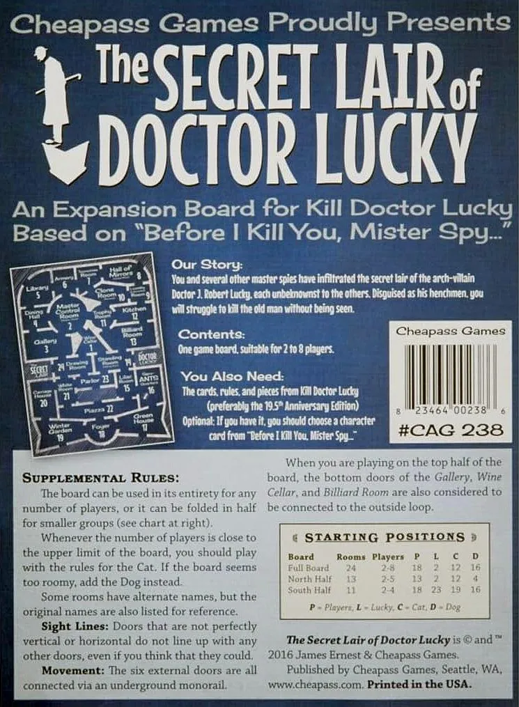 Players move around the mansion, collecting murder weapons (to make the murder attempt stronger - doubly so if the weapon is used in an appropriate location); failure cards (to thwart opponents’ plans); and movement cards (to try to get together with Doctor Lucky in a secluded location for his inevitable demise). Players try to convince others to use up their failure cards first, the better for when their own attempts come.