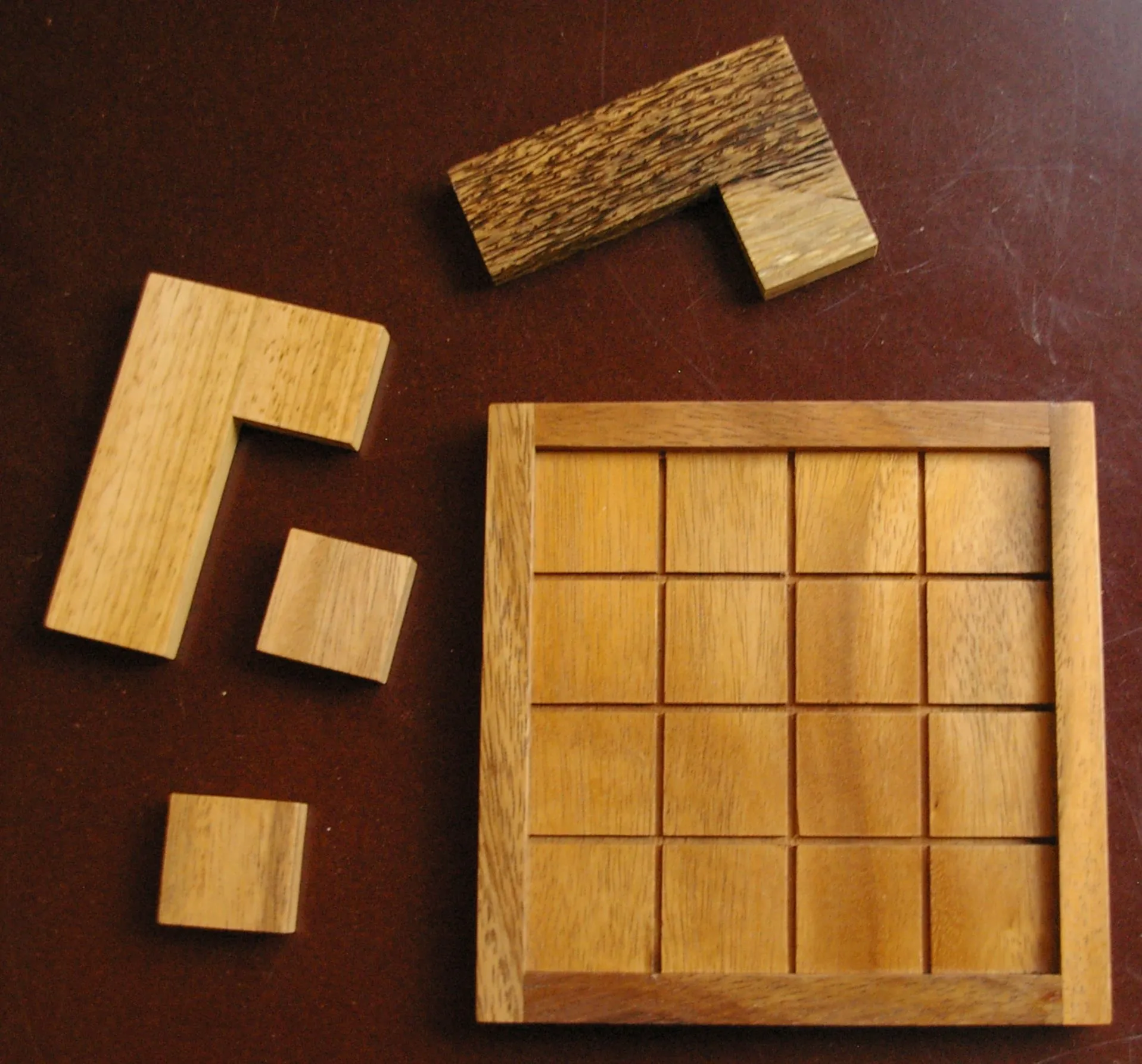 The L game was the result. Each player has only one piece. The board is four squares by four squares.