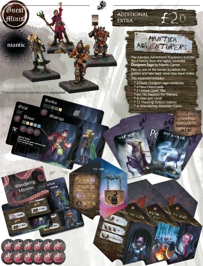 Miremarsh is a 40-60 minute game of strategy, skill, resource management and card buying for 1-5 players aged 14+. Players collect equipment items, gold and old bones to buy pets, items or spells to defeat the monsters and overcome traps that stand in their way to the final quest.
