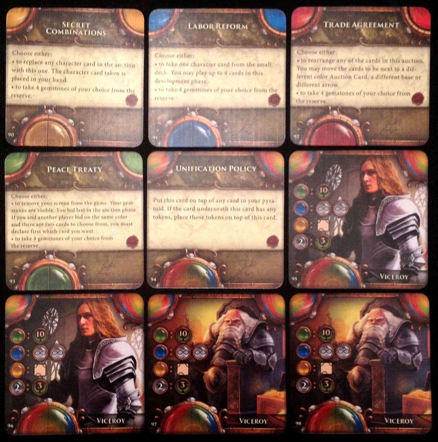 As the game progresses, each player builds their own power pyramid using character and law cards. Each card has its own effect that depends on the level of the pyramid where the card is played. These effects may give more resources, more cards, or victory points. The player who has the most power points at the end of the game becomes the ruler of entire Laar and the winner!