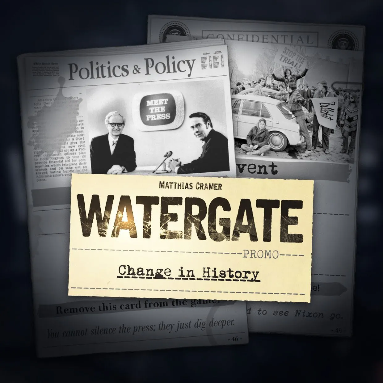 Dans ce jeu, deux joueurs s’affrontent en pleine affaire du Watergate. Le premier joue le rôle de l’administration Nixon et chercher à terminer son mandat sans encombre. Son adversaire incarne la presse et doit rassembler suffisamment de preuves pour forcer Nixon à démissionner. Qui sortira vainqueur de cette palpitante course contre la montre ? Recréez un duel historique haletant ! Avec ses règles accessibles et des paquets de cartes différenciés, Watergate vous plonge au cœur d’un incroyable scandale, pour un suspense renouvelé à chaque partie !