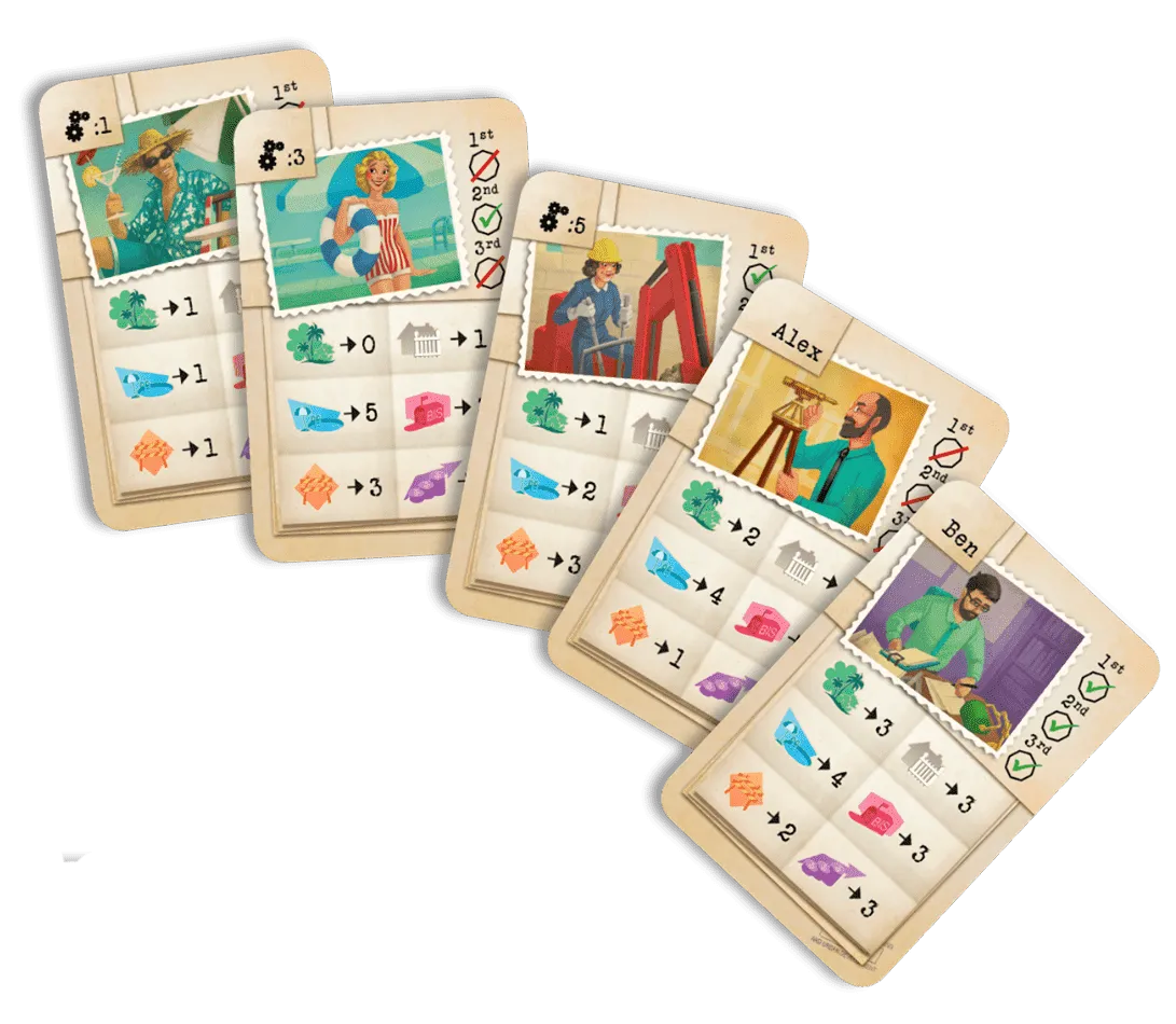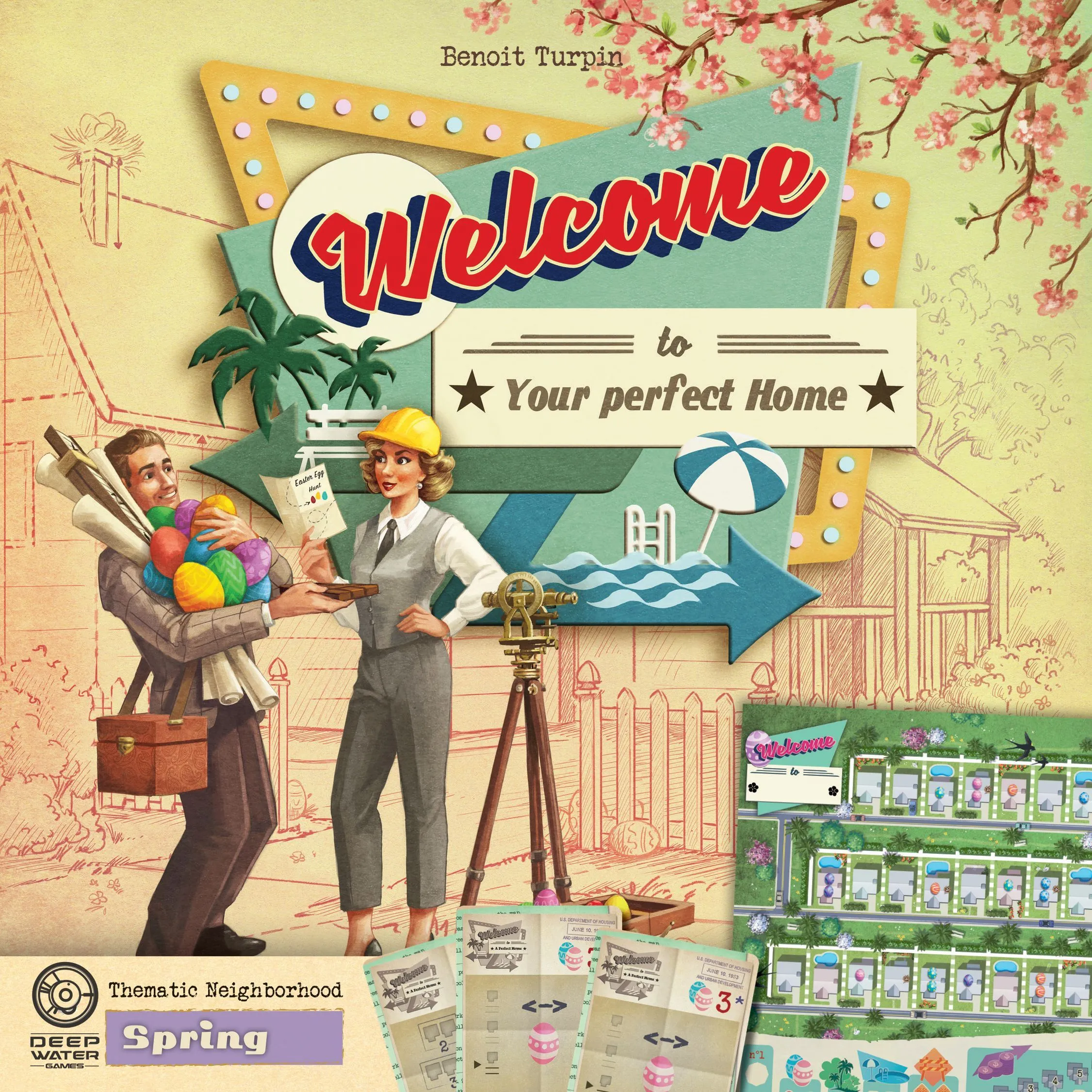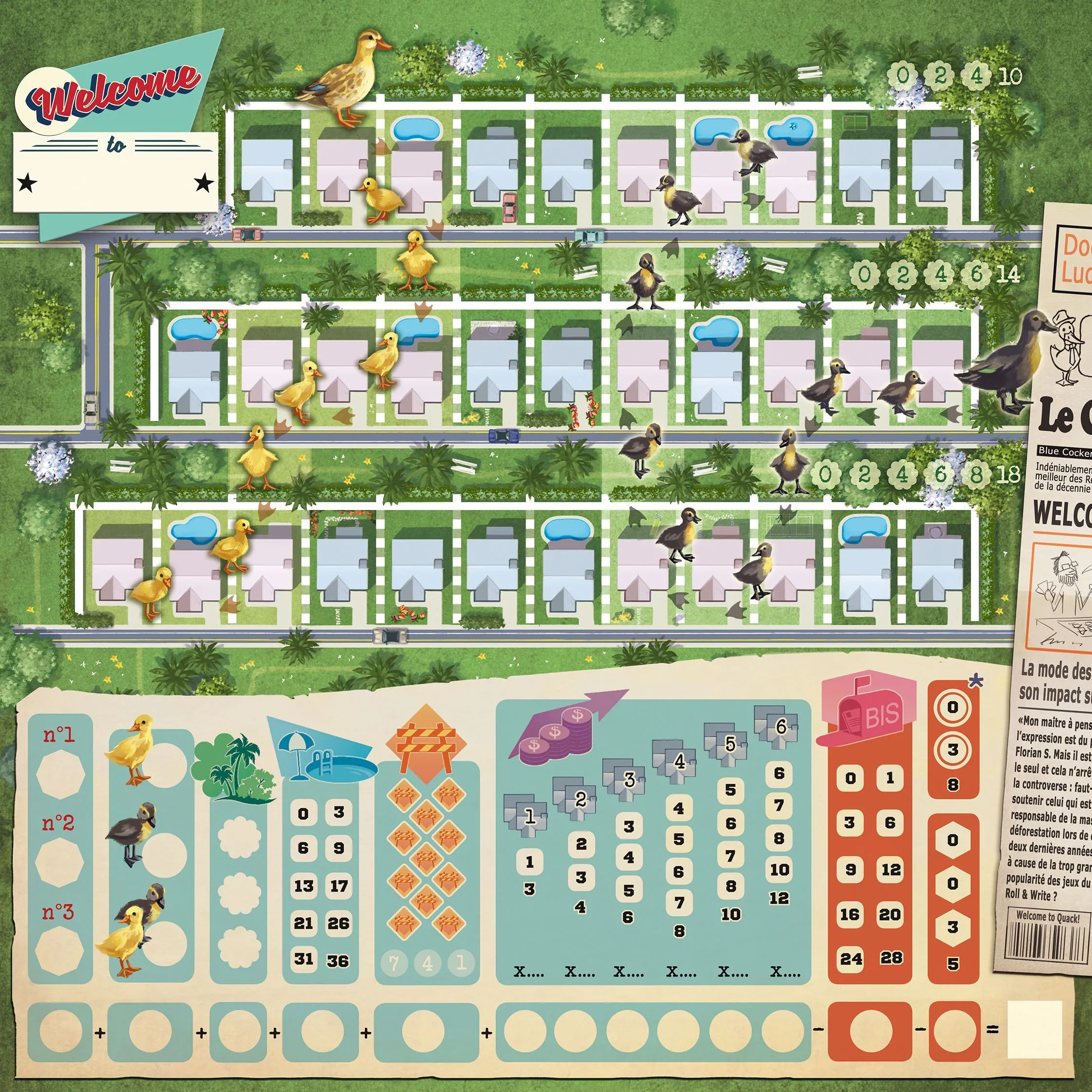 Welcome To… plays like a roll-and-write dice game in which you mark results on a score-sheet…but without dice. Instead you flip cards from three piles to make three different action sets with both a house number and a corresponding action from which everyone chooses one. You use the number to fill in a house on your street in numerical order. Then you take the action to increase the point value of estates you build or score points at the end for building parks and pools. Players also have the option of taking actions to alter or duplicate their house numbers. And everyone is racing to be the first to complete public goals. There’s lots to do and many paths to becoming the best suburban architect in Welcome To…!