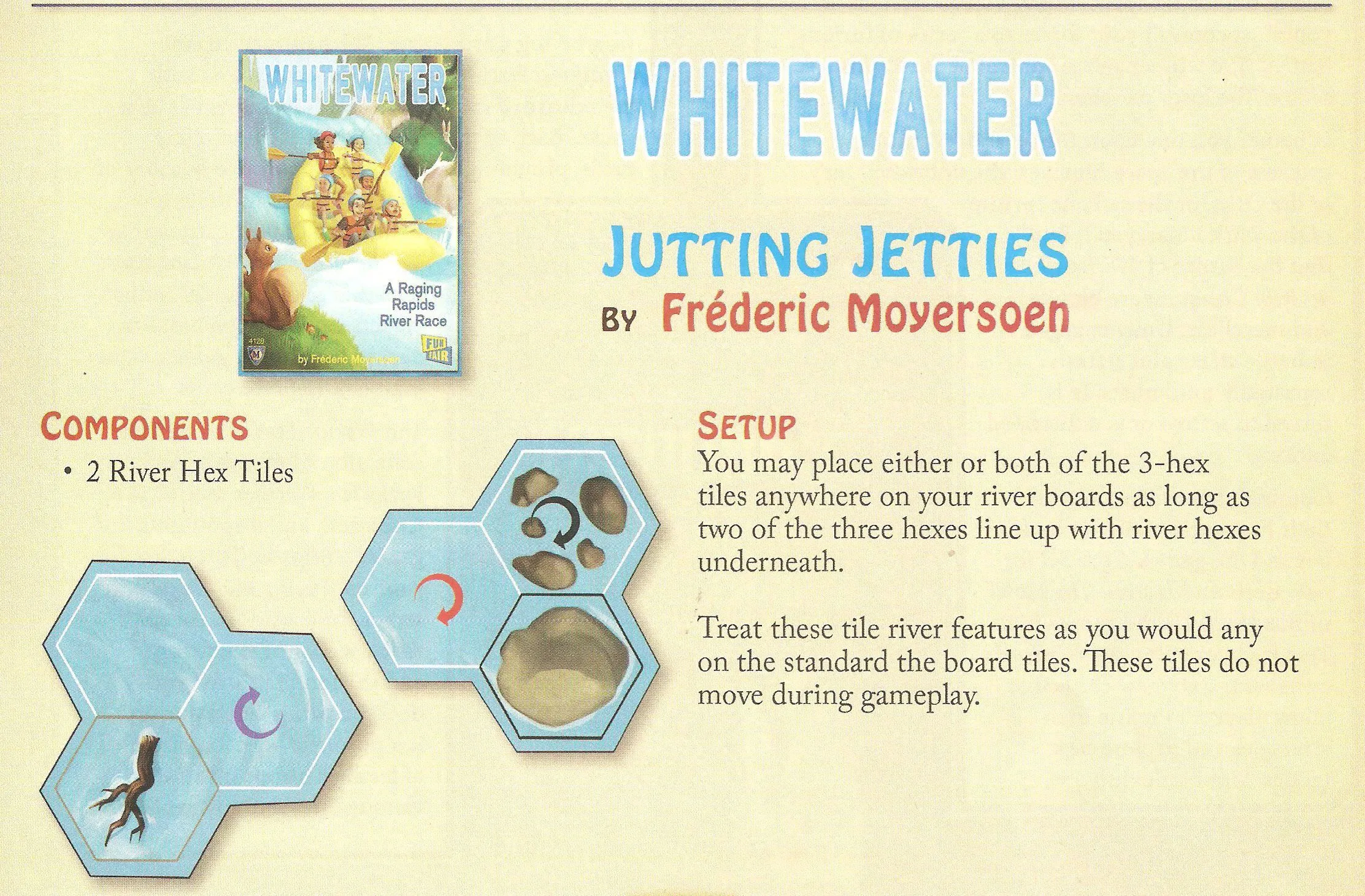 In Whitewater each player directs the actions of four courageous rafters. Each raft in the race contains four crew, with two crew from you and two from another player. Players control the crew within a raft, but also may use Energy cards to additionally help one raft or the other. Dice represent the effects of hazards you encounter, and even your best-laid plans can be spoiled by another raft pushing you a direction you don’t want to go. Earn points for getting your rafts and passengers home safely, while navigating through treacherous waters containing rocks, driftwood and the dreaded whirlpool!
