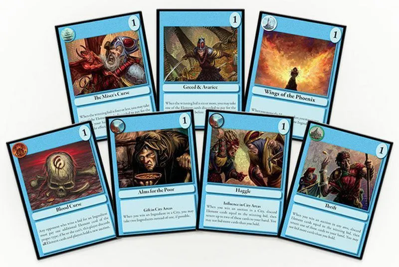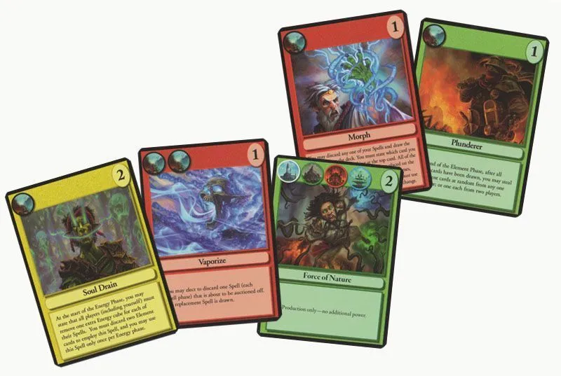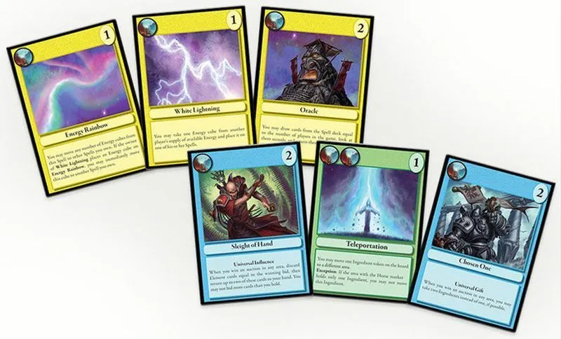 Spell cards generate the Element cards depicted on them for their owners. You then use these Element cards to bid on and collect Ingredients. You can bid for Ingredients only with the Elements shown on the landmark tokens on areas of the game board; these tokens are placed randomly each game. To increase the strategy and player interactivity, some Spell cards let you bid extra cards or different cards, while others allow you to change the rules for bidding. After visiting 3-6 areas, with the number being determined by a die roll at the start of the round, the round ends and players remove Energy cubes from their spells.
