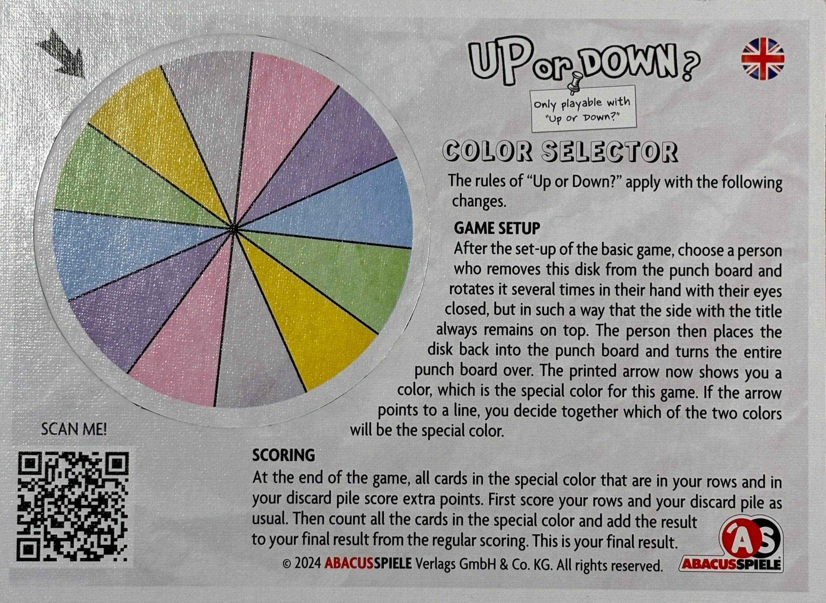 Pour terminer votre tour, tirez une carte de l’une ou l’autre pile à l’intérieur de l’anneau. Une fois que toutes les cartes du jeu ont été jouées, comptez vos rangées. Pour chaque rangée, multipliez le nombre de cartes de cette rangée par le nombre de cartes de la couleur la plus courante de cette rangée. Pour chaque carte de votre pile de défausse, marquez 1 point. Celui qui a le plus de points gagne la partie de Up or Down?**