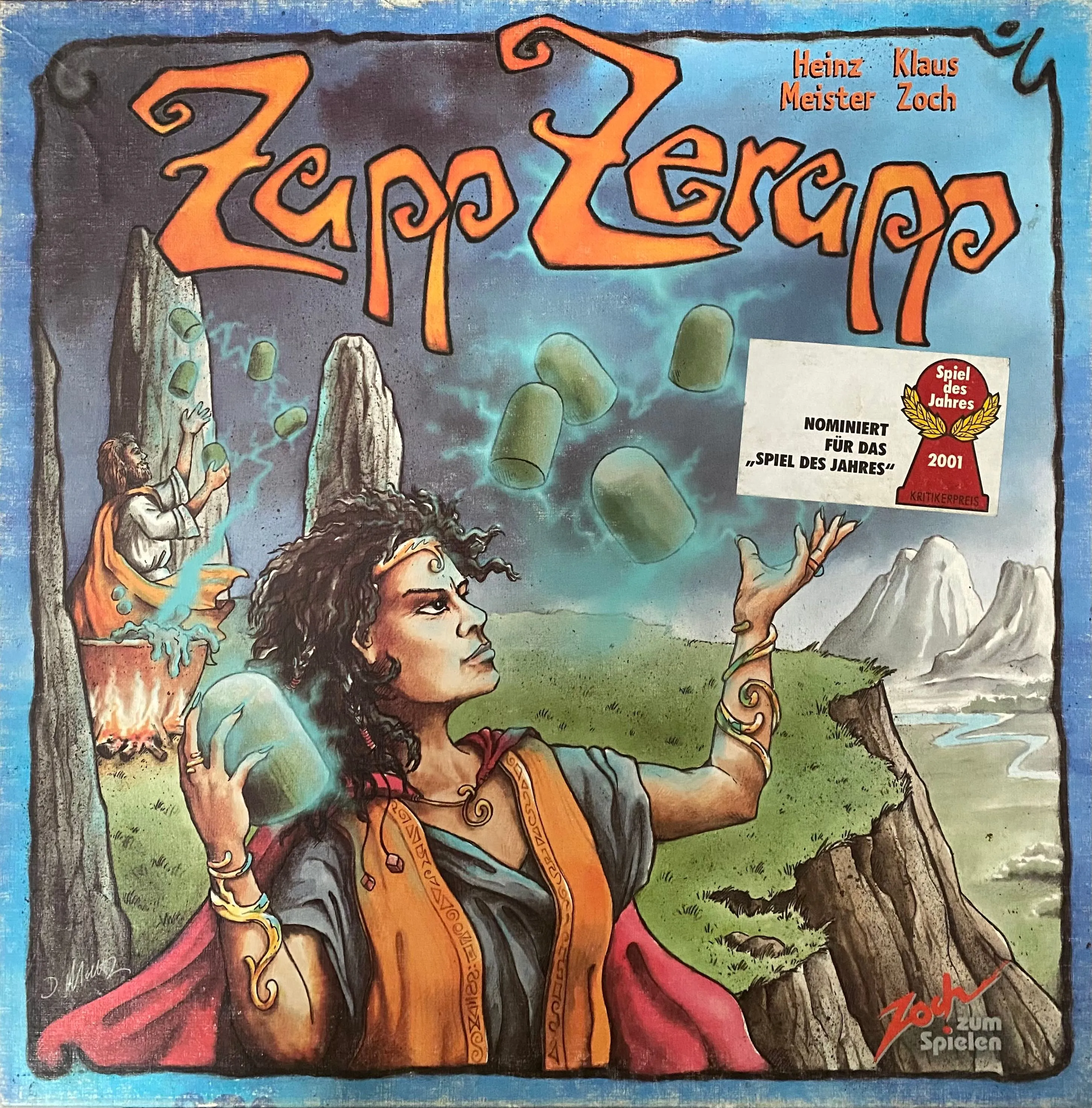This is a very novel take on the old parlor game, Parcheesi or Sorry or even Trouble, that many people remember. Players are trying to get their pawns from their starting position around the board into the safe zone. If a pawn is either landed on or passed over by another player’s pawn, the jumped pawn is returned to its starting location. However, players don’t simply roll the dice and move in Zap Zerapp. Instead, two dice are rolled and results are announced to the table. Players simultaneously start picking up one of the thirteen little wooden containers and shaking them. Inside the containers are one to thirteen lead pellets. Players are trying to select the container with the highest number of pellets, so long as it doesn’t exceed the result of the dice. Once all players have selected their container (the number of pellets are denoted on a sticker on the bottom), players move one-by-one from highest to lowest, assuming their selection allows them to move at all by being lower.
