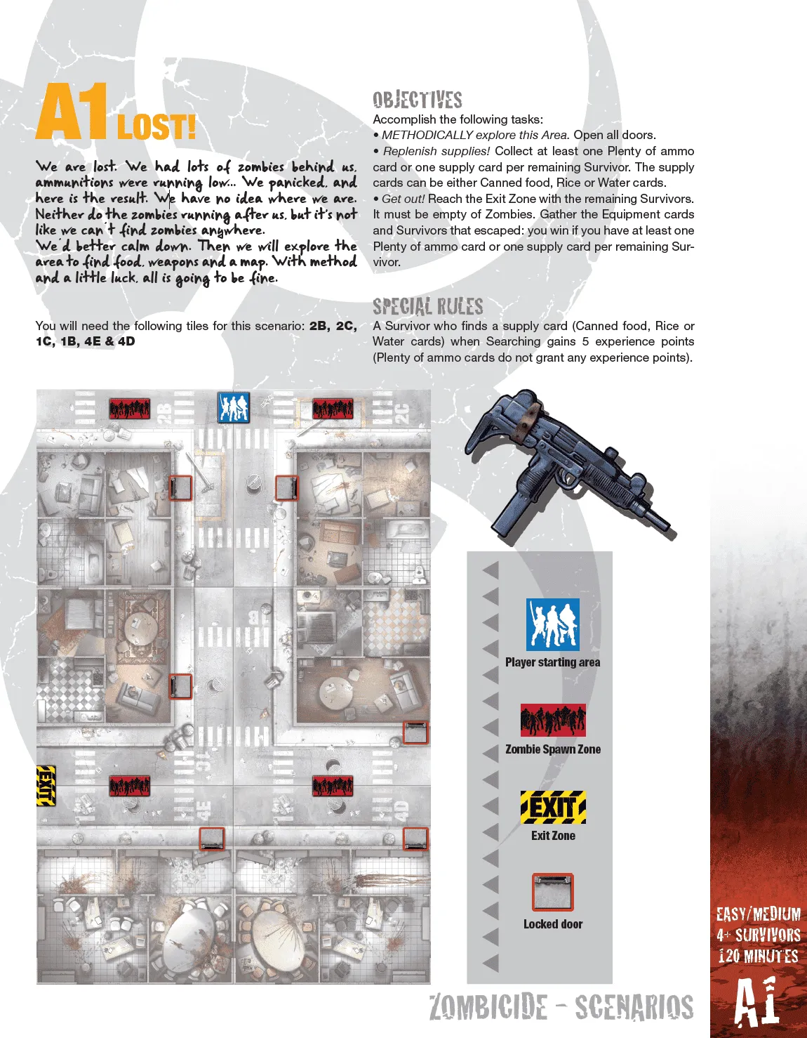 Find weapons, kill zombies. The more zombies you kill, the more skilled you get; the more skilled you get, the more zombies appear. The only way out is zombicide!