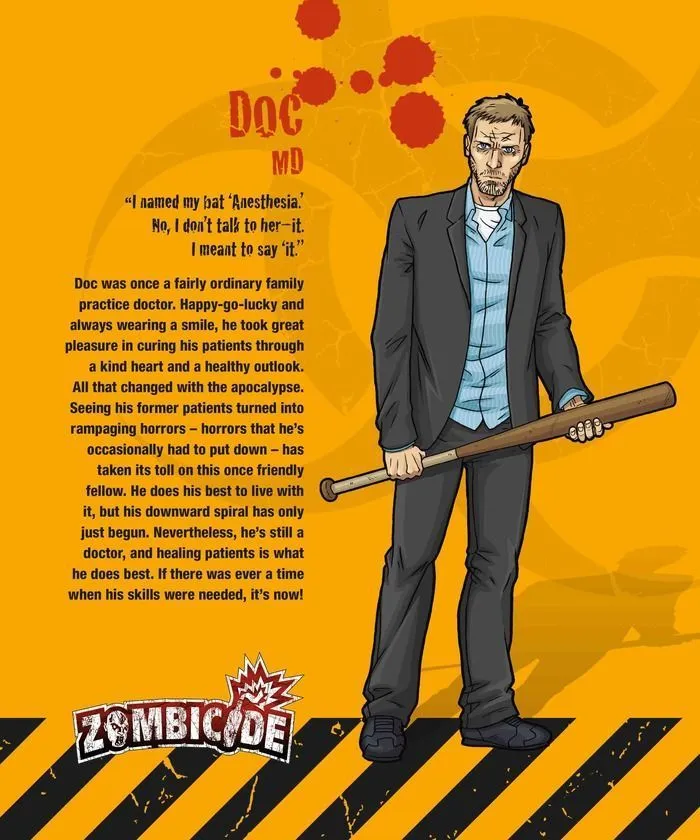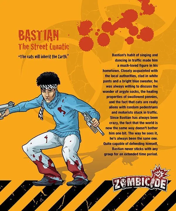Zombicide is a collaborative game in which players take the role of a survivor β each with unique abilities β and harness both their skills and the power of teamwork against the hordes of unthinking undead! Zombies are predictable, stupid but deadly, controlled by simple rules and a deck of cards. Unfortunately for you, there are a LOT more zombies than you have bullets.