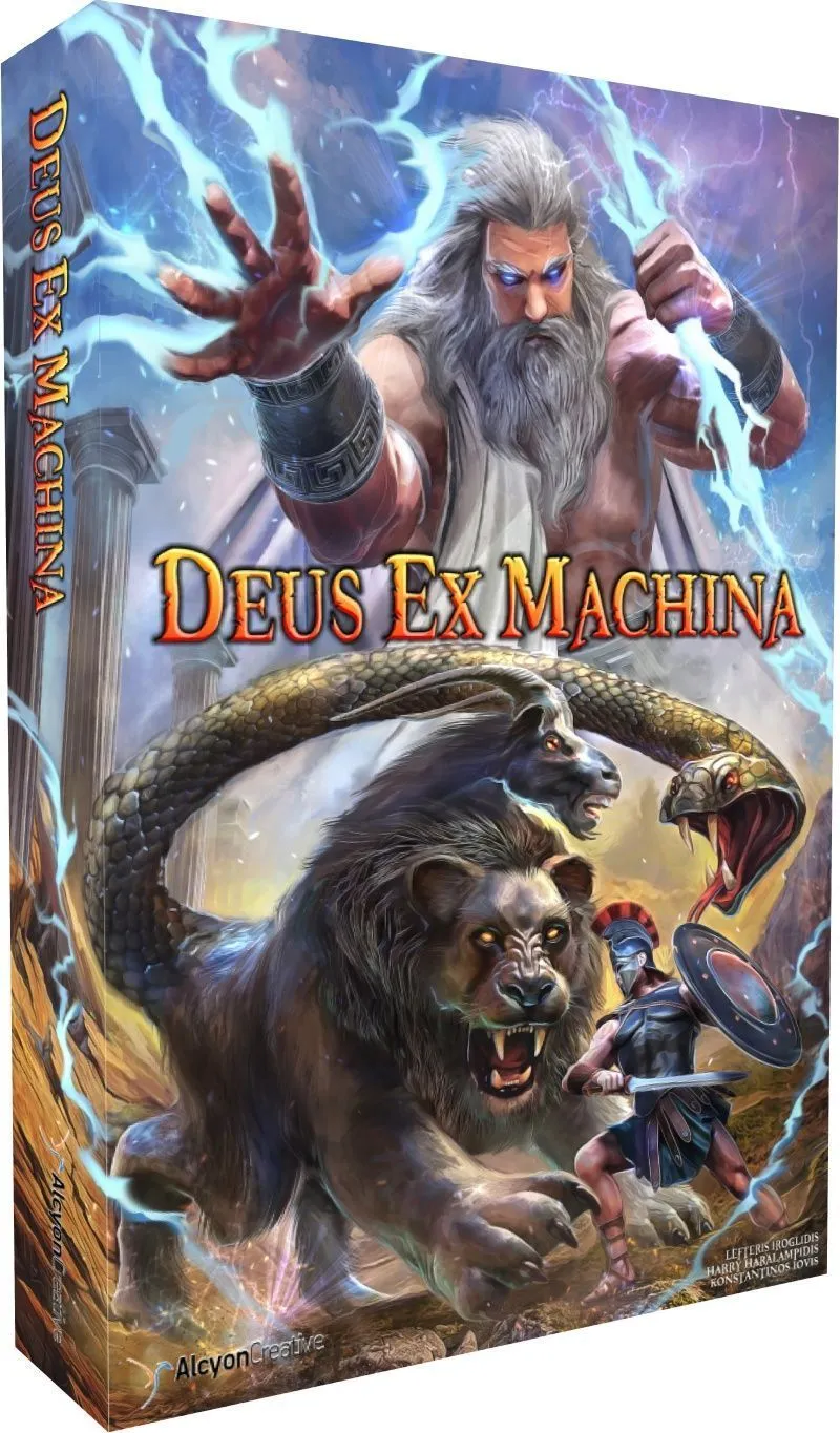 Deus Ex Machina est un petit jeu de placement d’ouvriers (se jouant avec des cartes) sur le thème de dieux s’affrontant à travers les différents héros et créatures de la mythologie grecque. Le thème est un peu bateau mais les mécaniques l’exploitent bien, les dieux cherchant la “réputation” et devant payer pour utiliser certains héros qui sont affiliés à leurs adversaires. Le soutien est toutefois un peu onéreux une fois les fdp ajoutés ($44 fdpi) et la présentation ne rend pas du tout compte du jeu qui ressemble à un banal jeu de cartes d’affrontement.