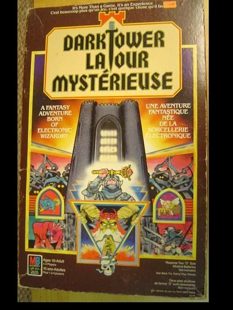 Dark Tower n’a aucun lien avec Stephen King et son oeuvre. Il s’agit en fait d’un des tous premiers jeux d’aventure sur plateau. Et aussi un des tous premiers à le faire grâce à un “ordinateur” (ou ce qui en tenait lieu en 1981) qui gère de nombreuses variables du jeu. Niché dans la tour noir au centre du jeu, celui-ci était accessible via un petit clavier à membrane sur sa base, la hauteur de la tour servant d’affichage.
