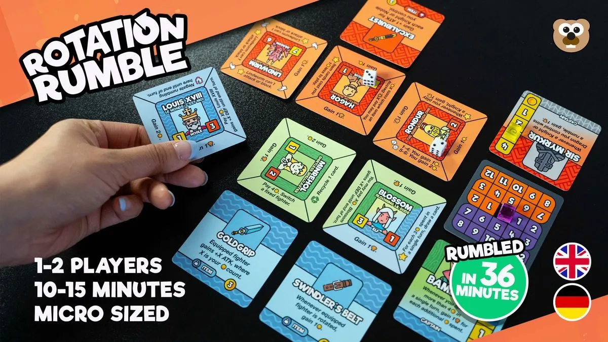Petit jeu, petite rĂšgle, petite partie mais ce nâest pour autant quâil est simpliste ! Le jeu est un bon mĂ©lange entre la gestion de ses cartes en main et les compĂ©tences des combattants. Dans Rotation Rumble, chaque deck est composĂ© dâun Capitaine possĂ©dant un pouvoir unique. De cartes Combattants pouvant ĂȘtre pivotĂ©es sur les quatre cotĂ©s, afin dâactiver des compĂ©tences. De cartes Ăquipements pour renforcer les combattants ainsi que de cartes Flash, Ă usage unique.