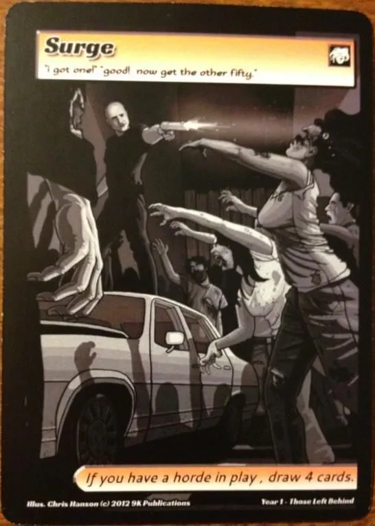 Throughout the course of the game you be able to defend your stronghold and scavenge for resources with survivors, and attack your opponent’s stronghold and scavenging locations with zombies and other raiders. A number of types of cards that both enhance your characters and affect the game in various ways can be played throughout the course of your turn.