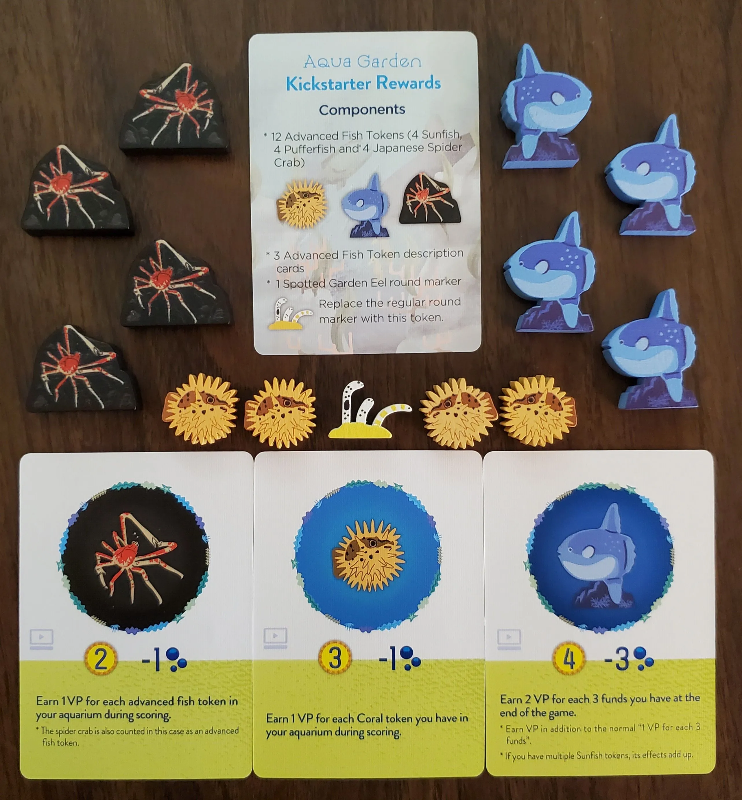 A game lasts 3-4 rounds depending on the number of players. You have your own aquarium board with six tanks, and a shared player board has sea creatures placed at random on its perimeter. Seaweed and coral tokens are placed on the separate sea board, along with five random sea creatures.