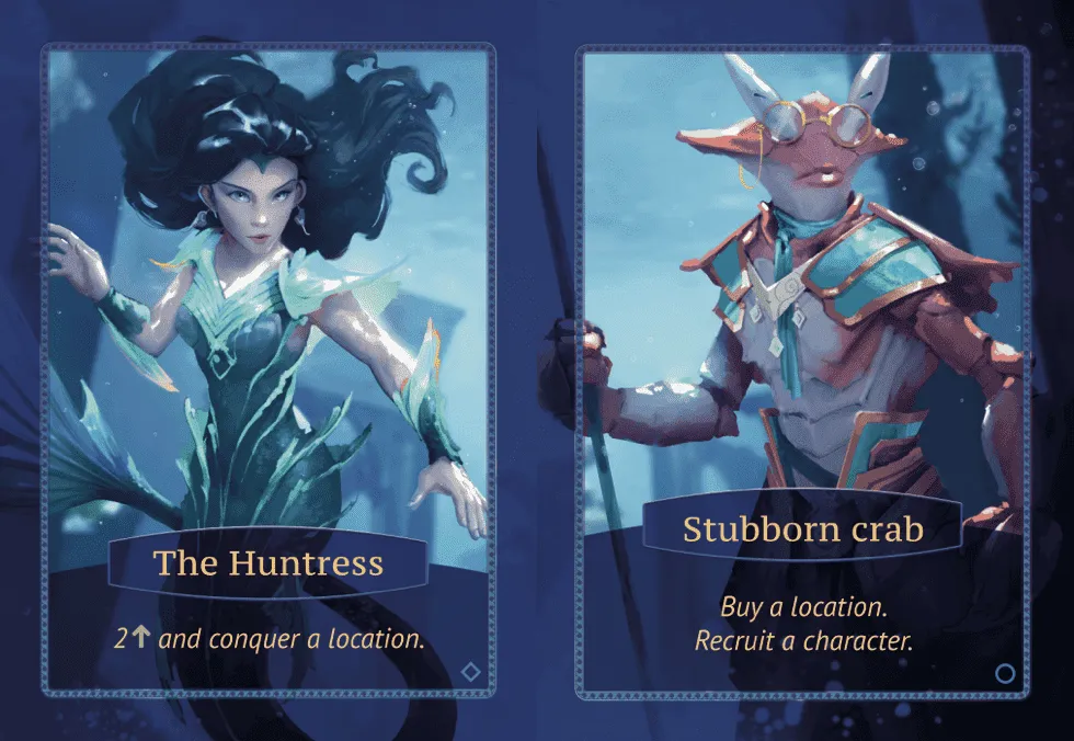 You will encounter plenty of mysterious ocean creatures and take them to your hand. With their help you will explore the unknown locations and raise found resources from the ocean depths to your kingdom. Mechanically this is represented with the help of three-layered player board and the unique mechanism of card-rising.