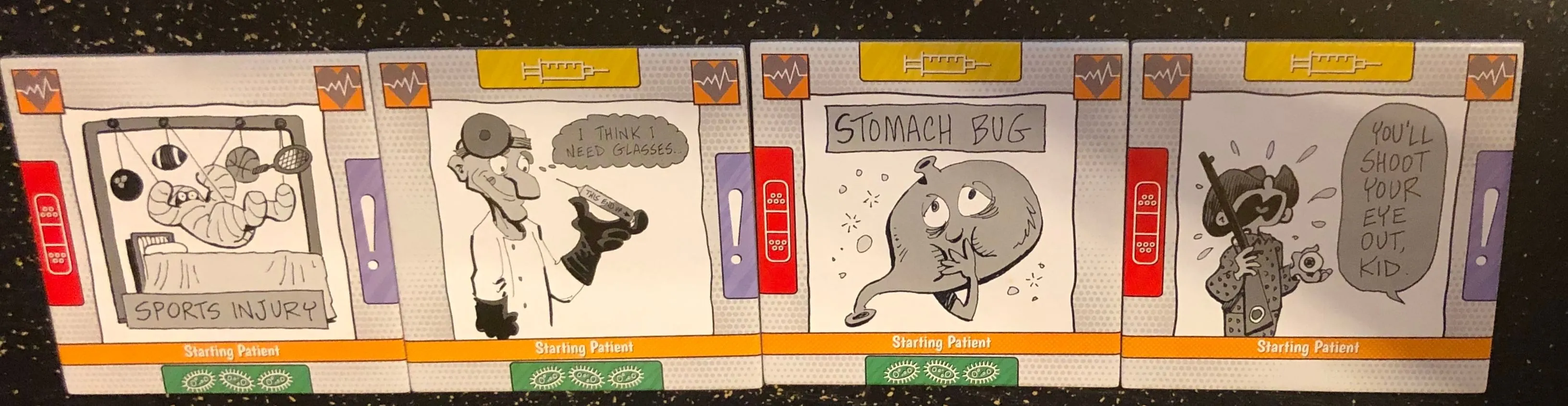 In more detail, Bad Doctor is a light tile-laying game in which doctors compete for the glory of being the best doctor by treating and curing patients. Treat patients by laying treatment tiles with matching malady symbols. Place your doctor marker on that malady to show you helped cure that patient. You place complication cubes on patients who are not visited during your shift (or turn), but if that patient has no spaces left for complication cubes then that means the patient has died on your shift!
