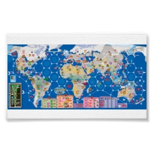 In Bios: Megafauna, a reworking of Phil Eklund’s own American Megafauna, players start as proto-dinosaurs or proto-mammals, starting in the post-holocaust world of the Permian catastrophe. Animals are tracked by dentition, size, aggressiveness, swiftness, browsing, grazing, burrowing, swimming, behavior, and insect-eating. Plants and animals that have gone extinct are collected in an area on the map called the tarpits. These tiles are distributed among the most populous players as victory points during four scoring rounds.