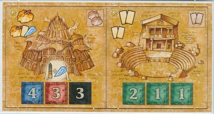 The player who first manages to add the required number of markers by paying crystals to the Obelisk wins the game. (four markers in a 4-player game, five markers in a 3-player game, and six markers in a 2-player game)