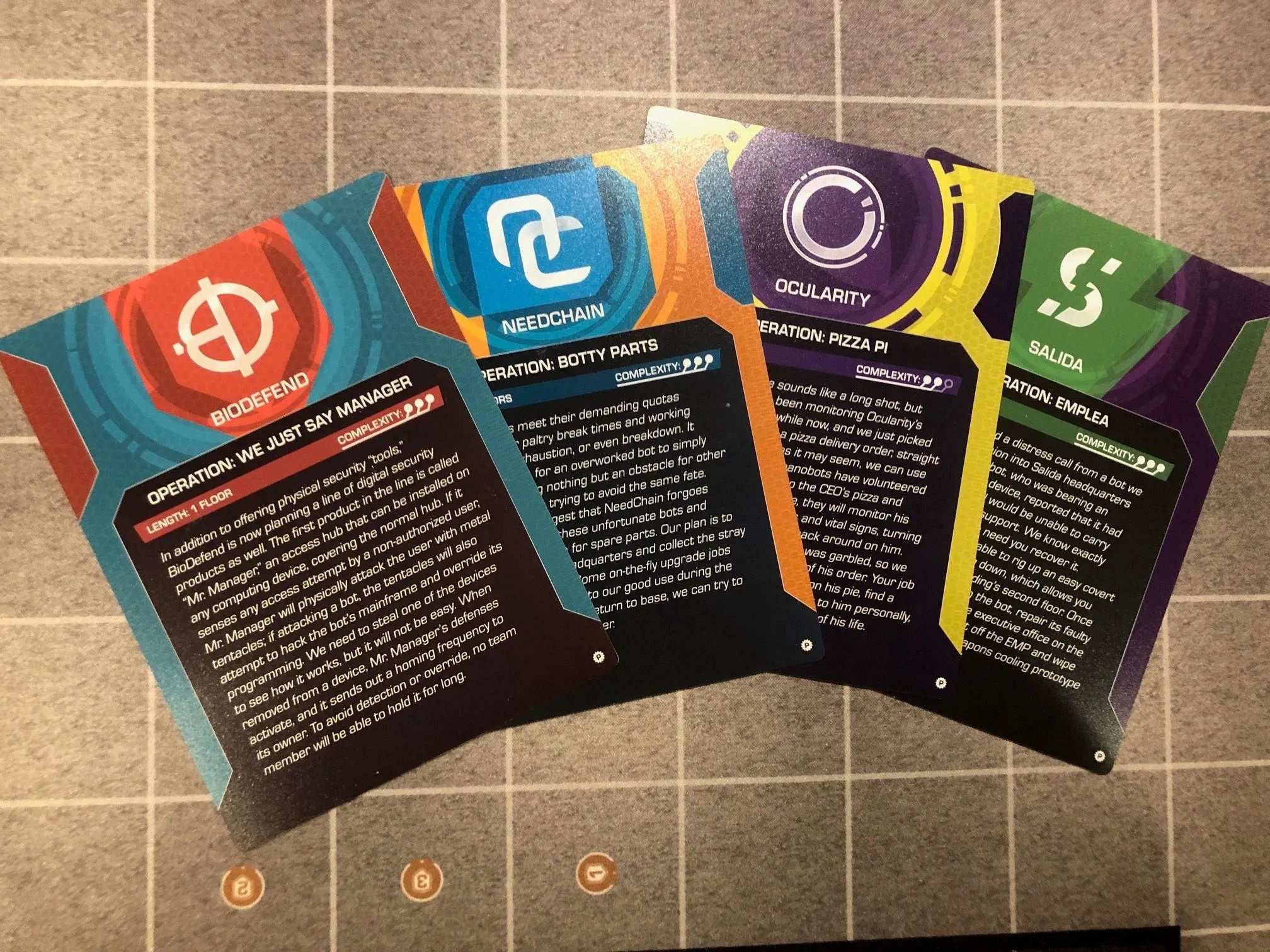 Each of the corporate headquarters in the game use unique neoprene layouts on a larger mat, changing the geography of the game to suit your target. Each CEO also has at their disposal a special threat meter, which will trigger new obstacles for your robots as time runs out. If you don’t complete the mission quickly, you may end up leaving bots behind, the victims of immobilizing power drains or destructive counterhacking.