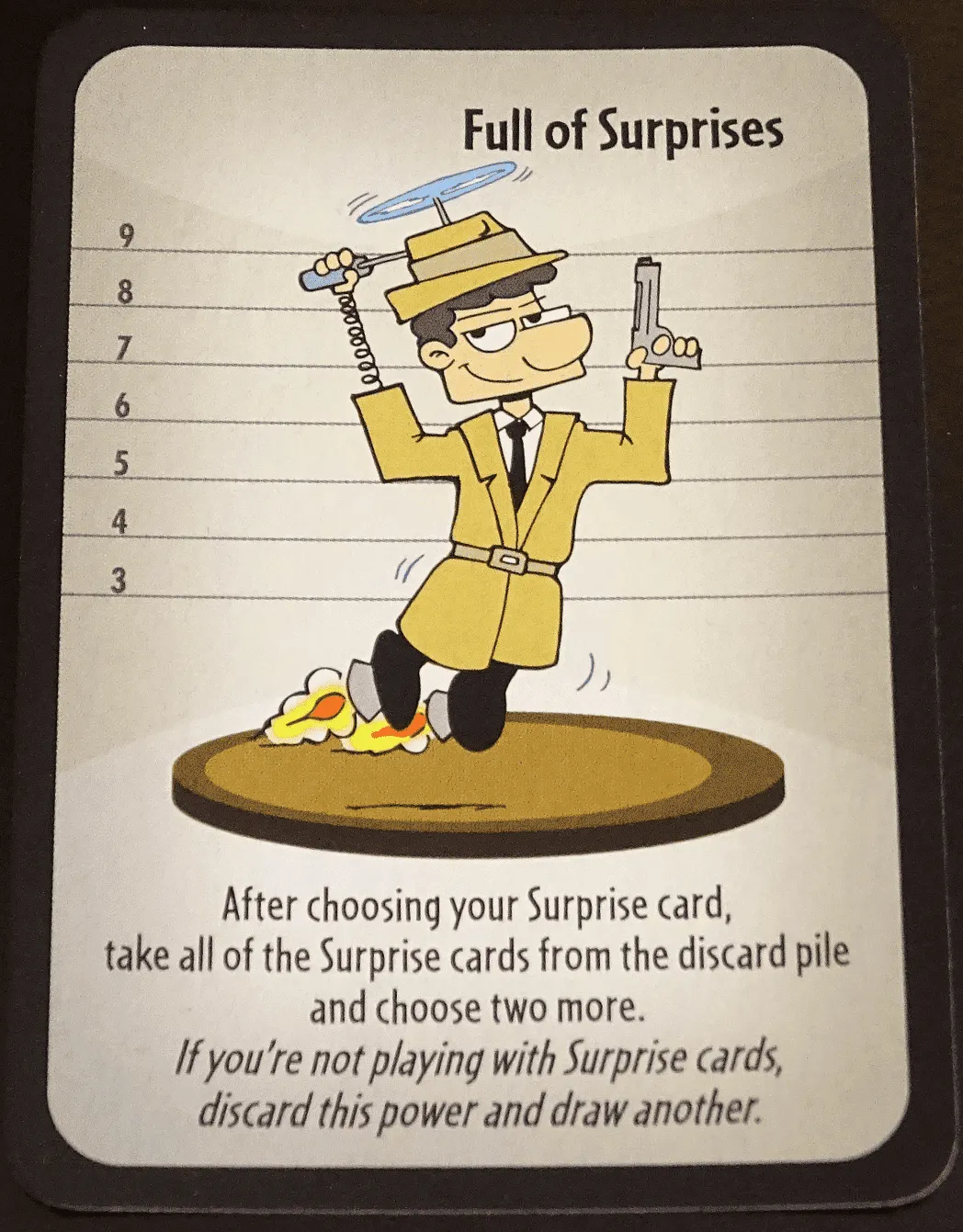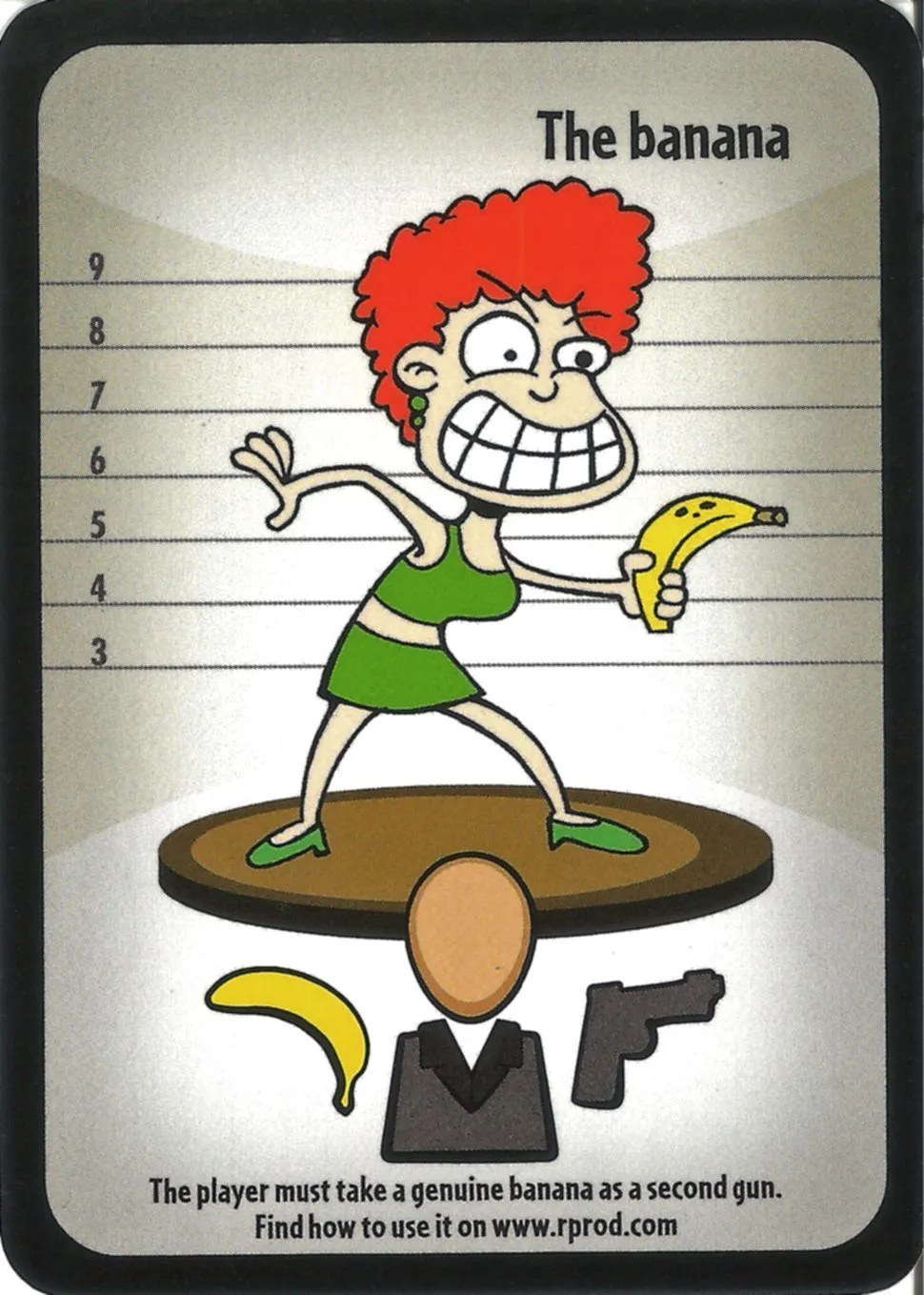 Everyone who’s pointing a gun at someone still in the round now reveals their card, and anyone who’s the target of a “Bang!” takes a wound marker and gets none of the available loot. Starting with the Boss, everyone still in the round takes one loot card at a time from the table — money, diamonds, paintings, the position of Boss, medical care (to remove a wound), or a new bullet (to add a “Bang!” card to your hand) — until everything has been claimed.
